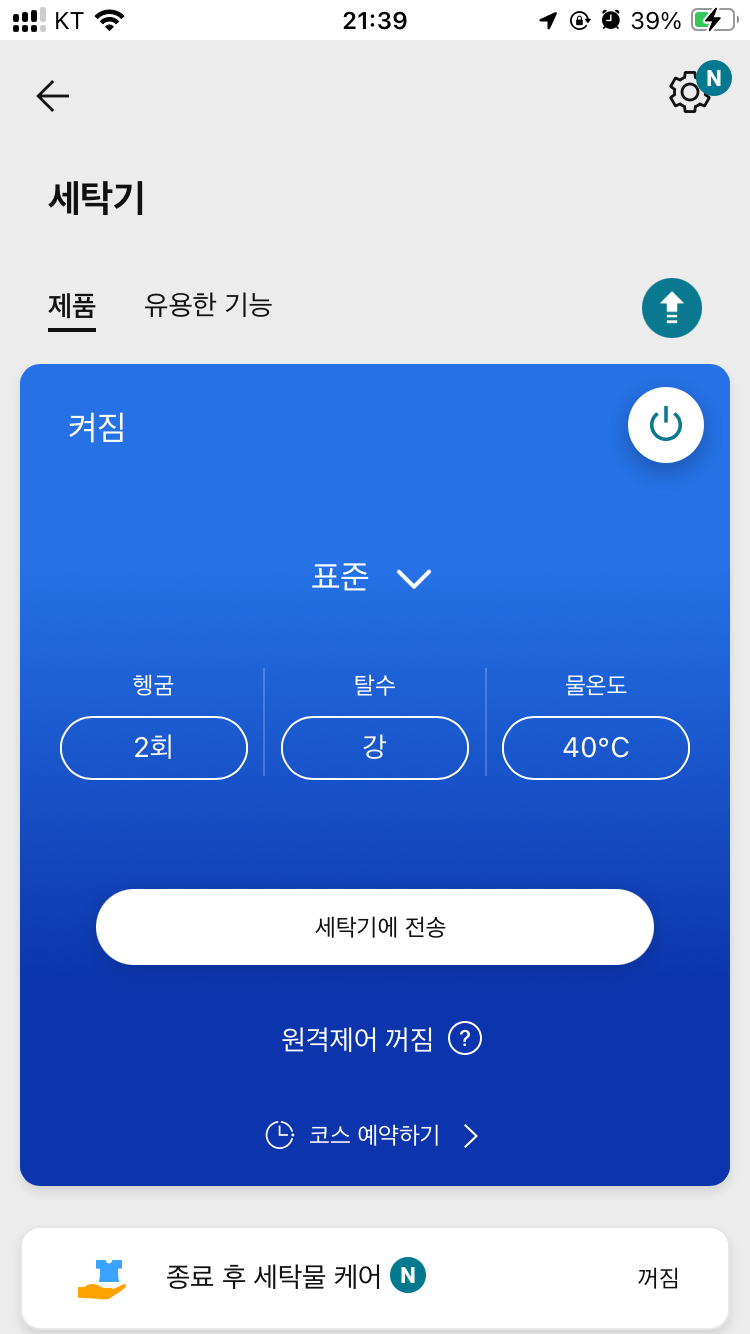 원격제어 규제에 대한 불만을 LG도 아는 건지 이번에는 원격제어 유지 기능이 추가되어 빨래가 끝난 이후에도 앱을 통해 추가로 코스 선택 및 빨래가 가능해졌습니다.