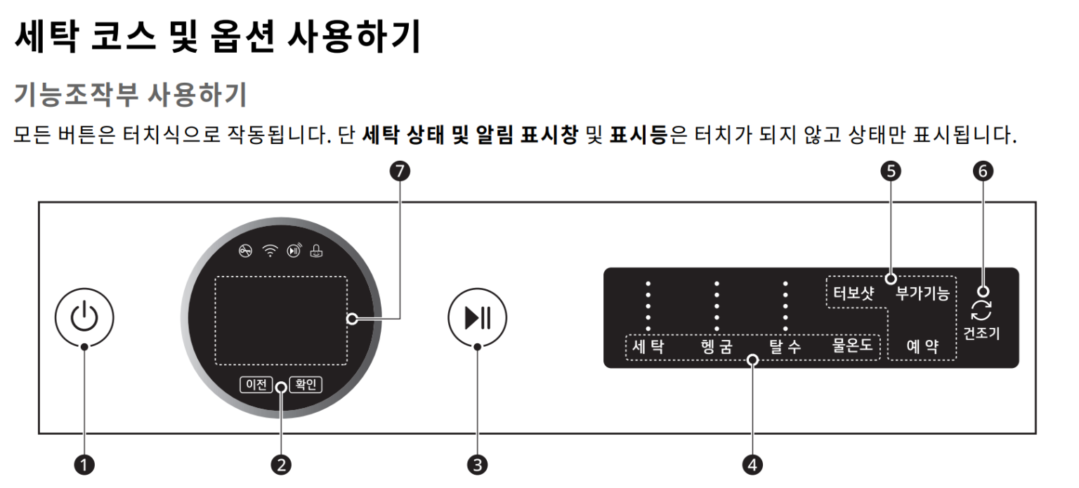 설명서를 보면 코스 조작부 맨 오른쪽에 건조기 제어 버튼이 있는데, 저희 집은 건조기가 없어 해당 버튼이 비활성화되어 있습니다. 건조기 사고 싶다 ㅠㅠ..
