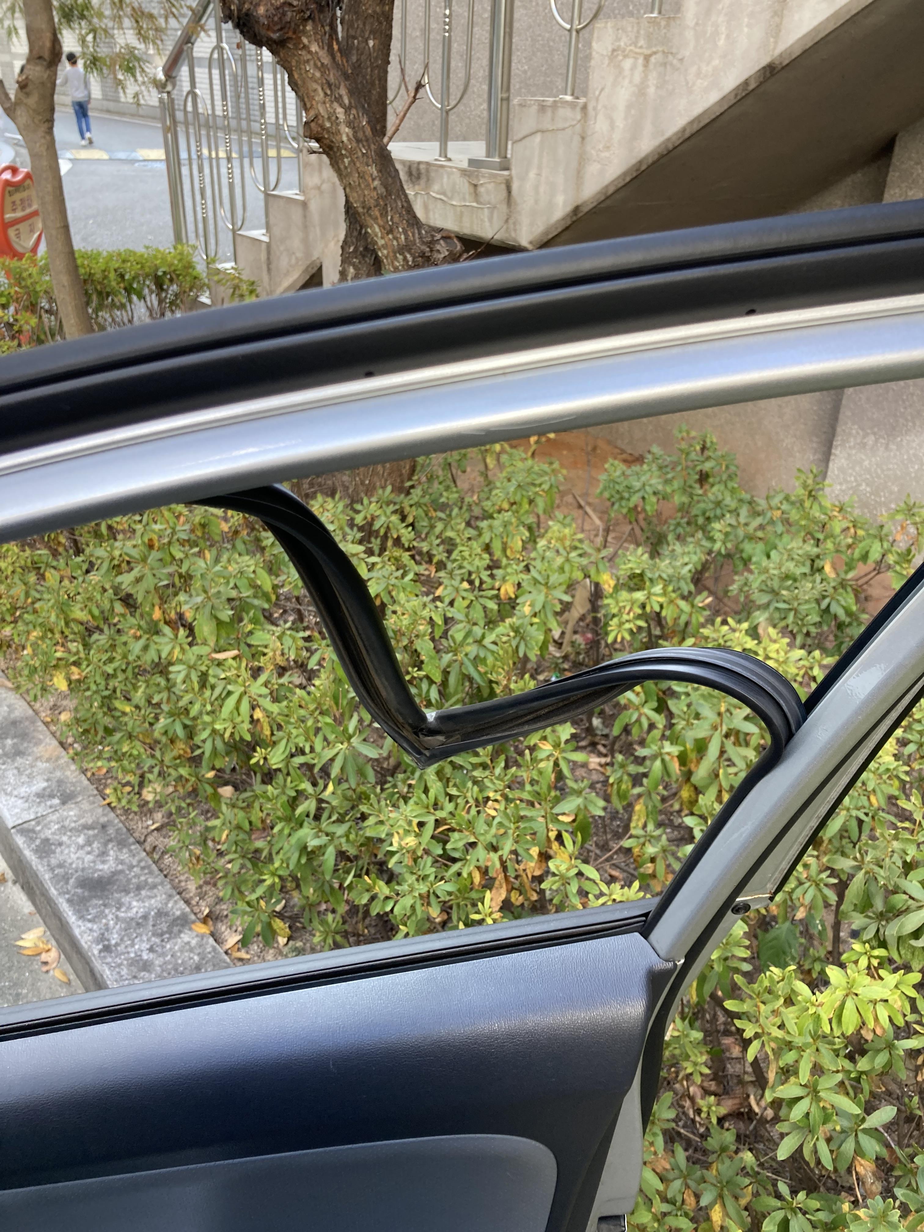 우선 글라스런을 교체할 도어의 유리창을 완전히 내리고, 글라스런 고무를 손으로 잡아당겨 분리합니다.