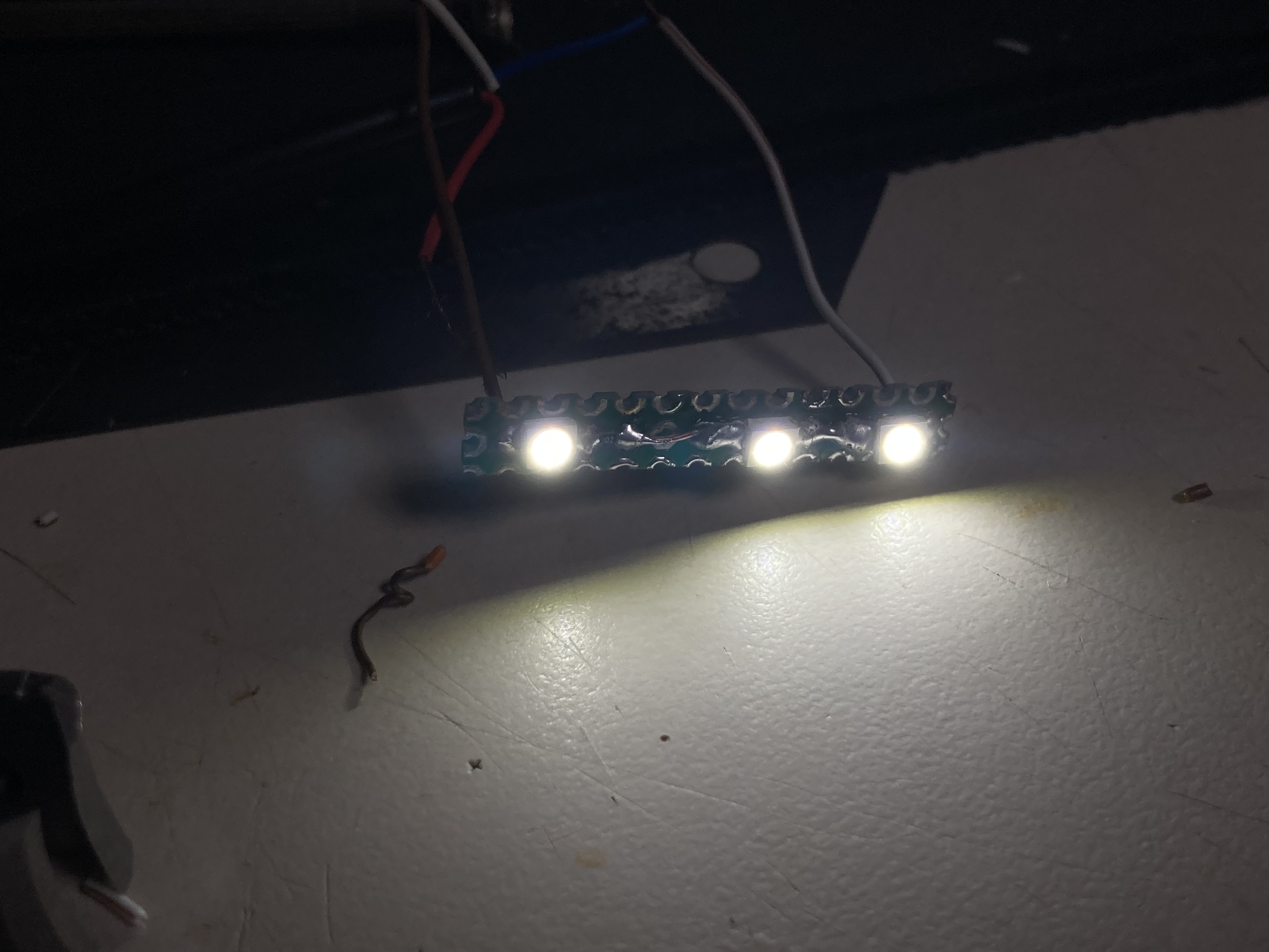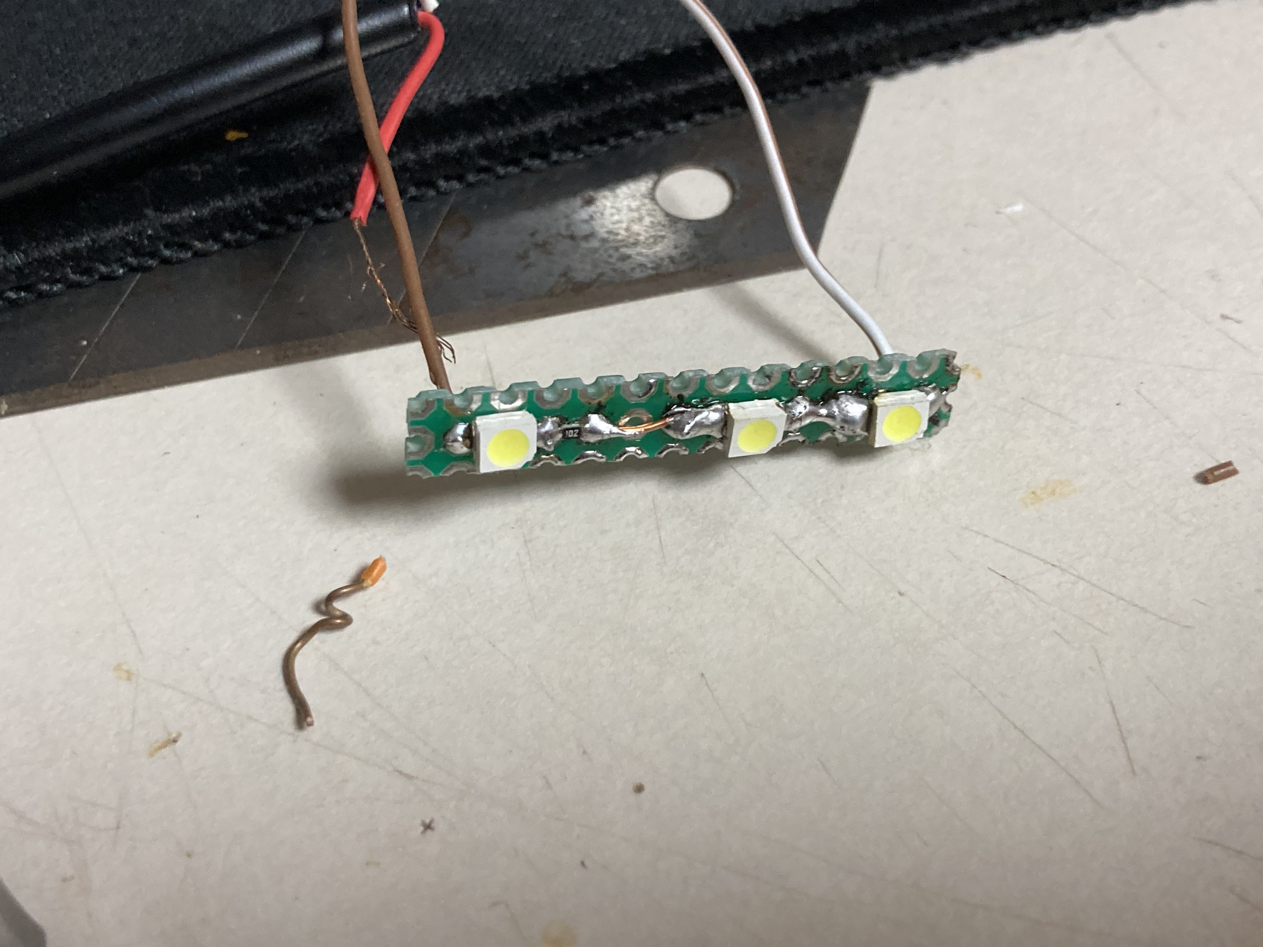 우선 만능기판에 LED 3발과 저항을 일렬로 연결하고, +/-극 배선을 14v 어댑터에 연결하여 이상이 없는 지 확인합니다.