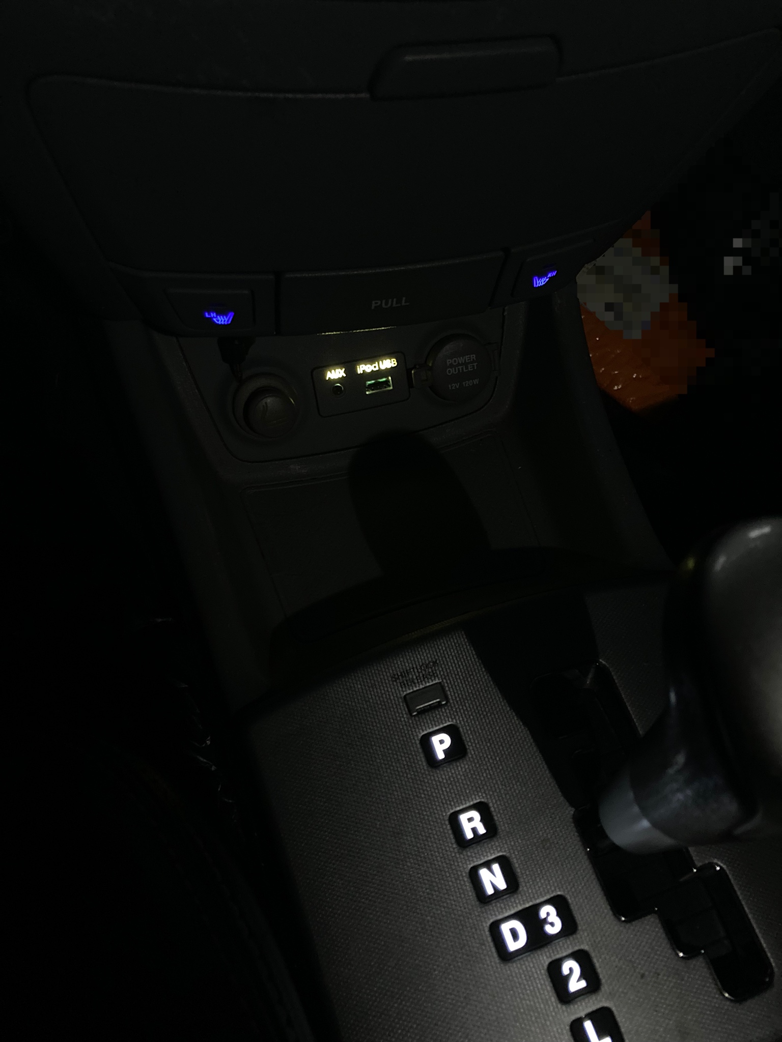 시거잭 및 USB 포트가 있는 콘솔 커버와 기어 패널을 탈거하고, 기어 패널의 미등 배선에 LED를 연결하고 테스트해봅니다.