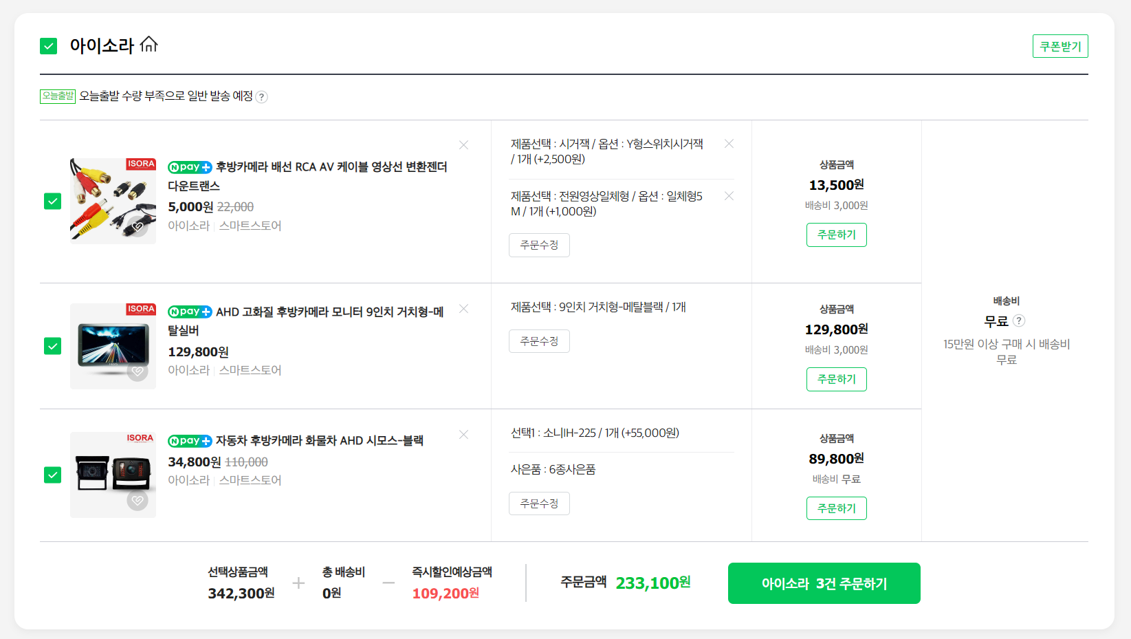 9인치 AHD모니터 + AHD카메라 조합으로 했을 때, 세트 상품이 실제로 33,300원 더 저렴했습니다.
