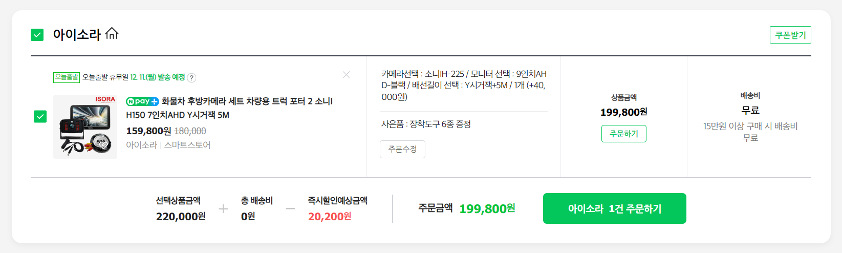 원래는 세트가 있는 줄도 모르고 카메라 따로 모니터 따로 담았는데, 구성품이 뭐가 필요한지 몰라서 아이소라 고객센터에 전화해보니 "따로 사지 마시고 세트로 구매하시는 게 더 저렴하고 필요하신 구성품이 전부 포함되어 있다"고 합니다.