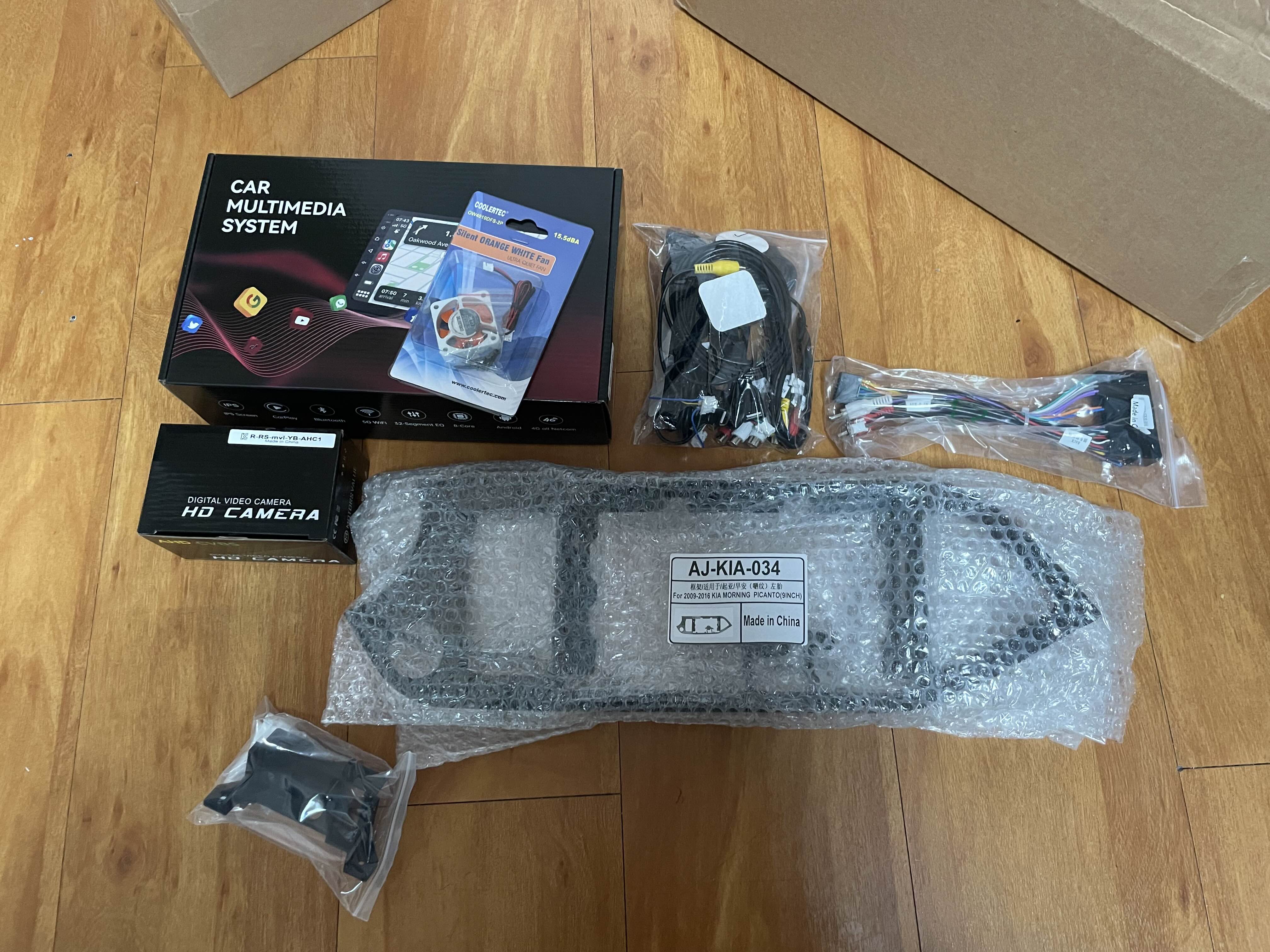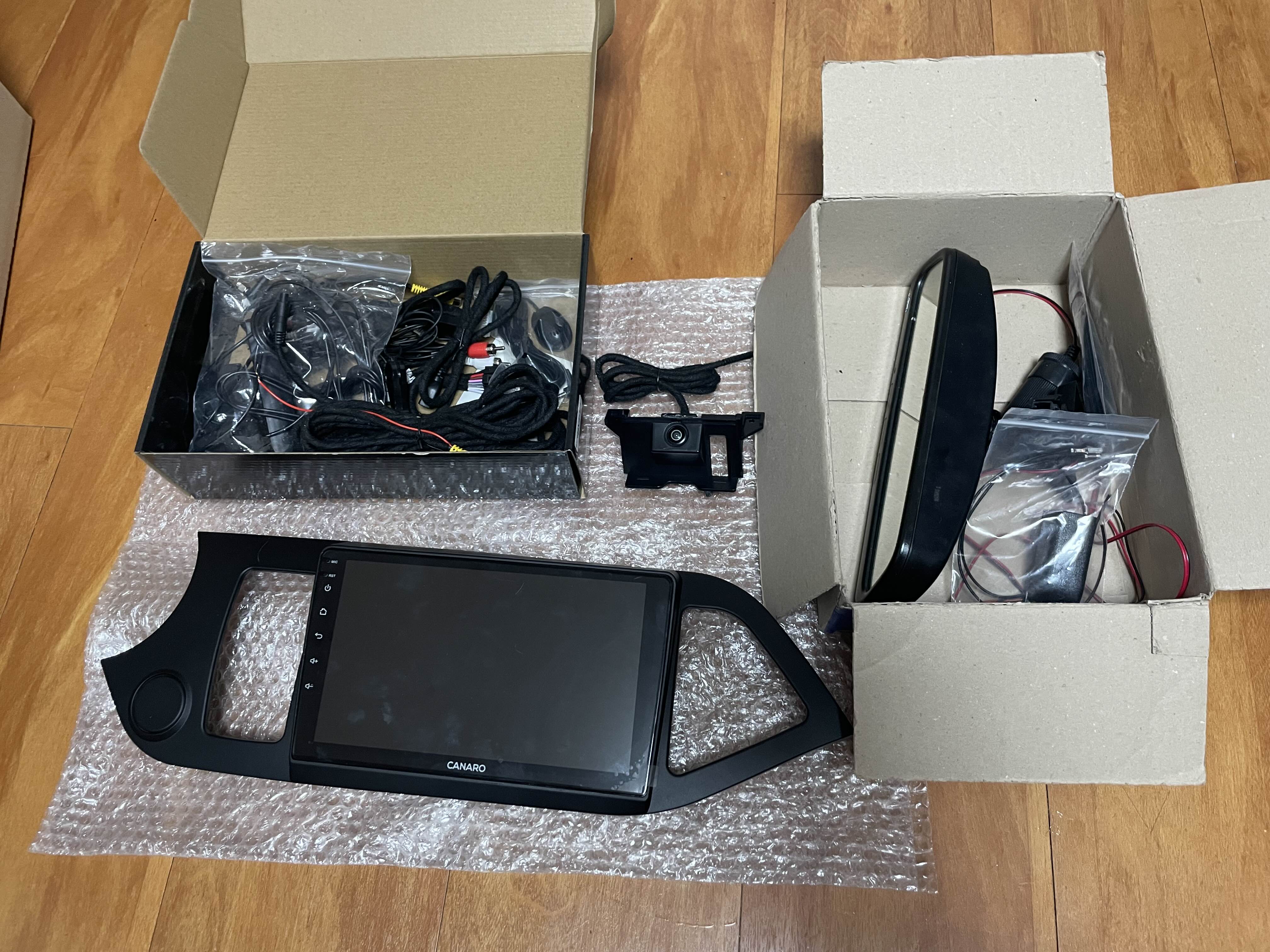 모닝 전용 마감재와 안드로이드 올인원 및 각종 배선, 후방카메라와 브라켓입니다.