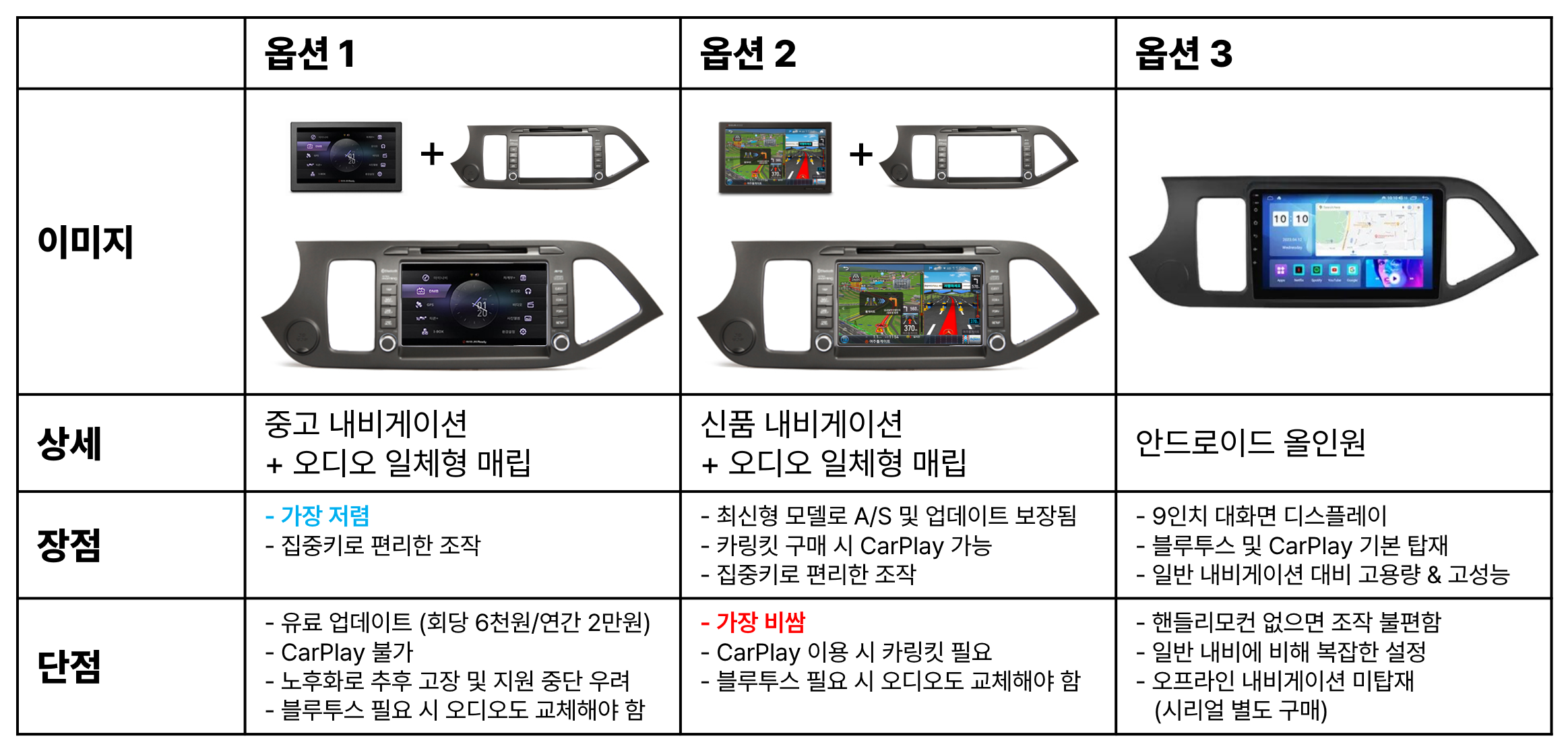 요즘은 그냥 내비게이션 매립보단 안드로이드 올인원을 많이들 선호하셔서 혹시 몰라 옵션에 포함해봤습니다.