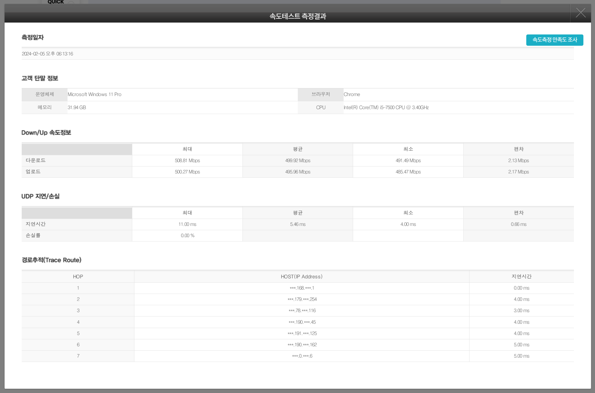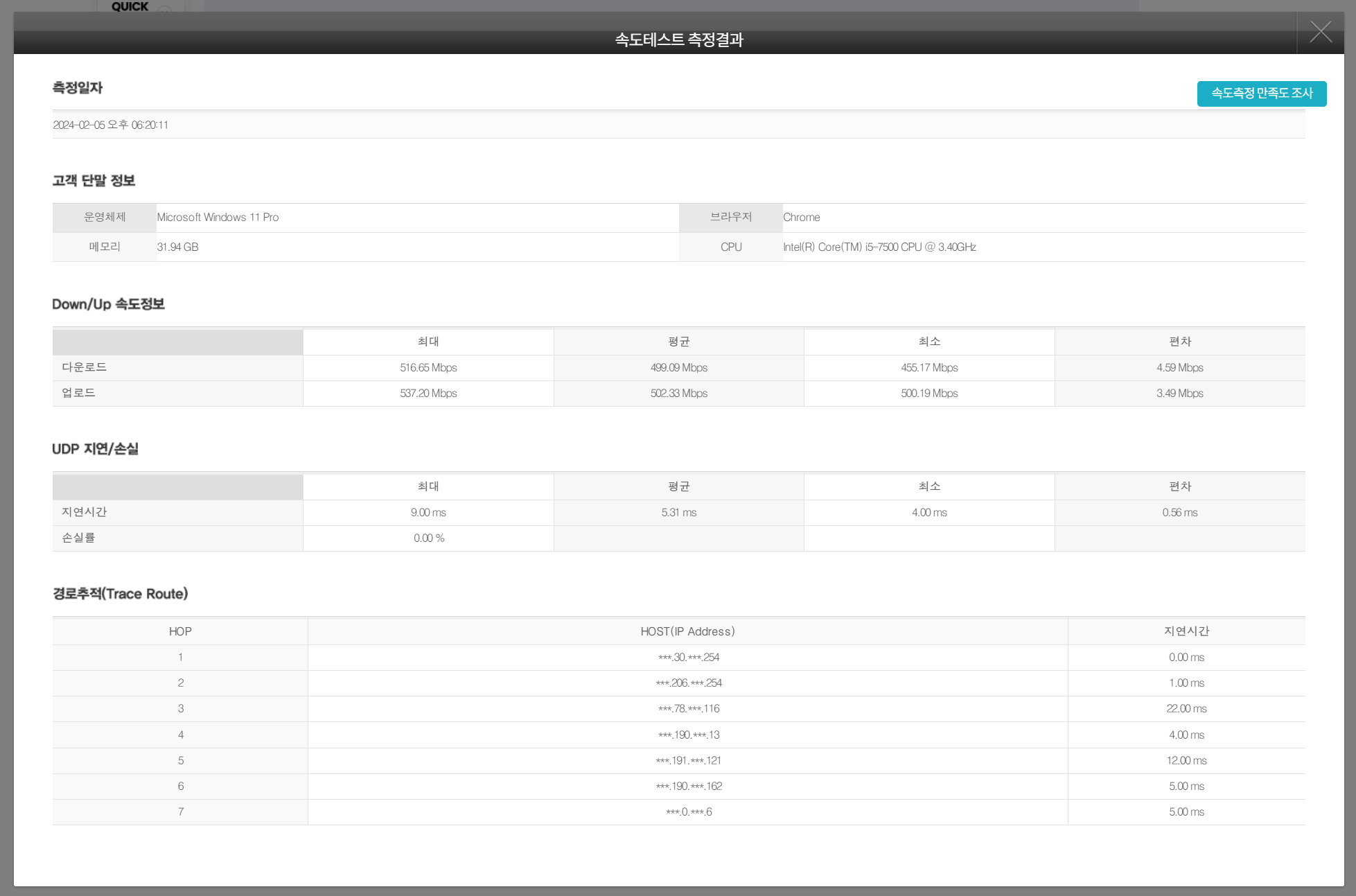 실성능은 어떨지 궁금해서 간단하게 속도측정을 해봤습니다. speedtest.net은 매 테스트 시마다 오차가 너무 커서 KT에서 제공하는 속도측정을 이용했습니다.