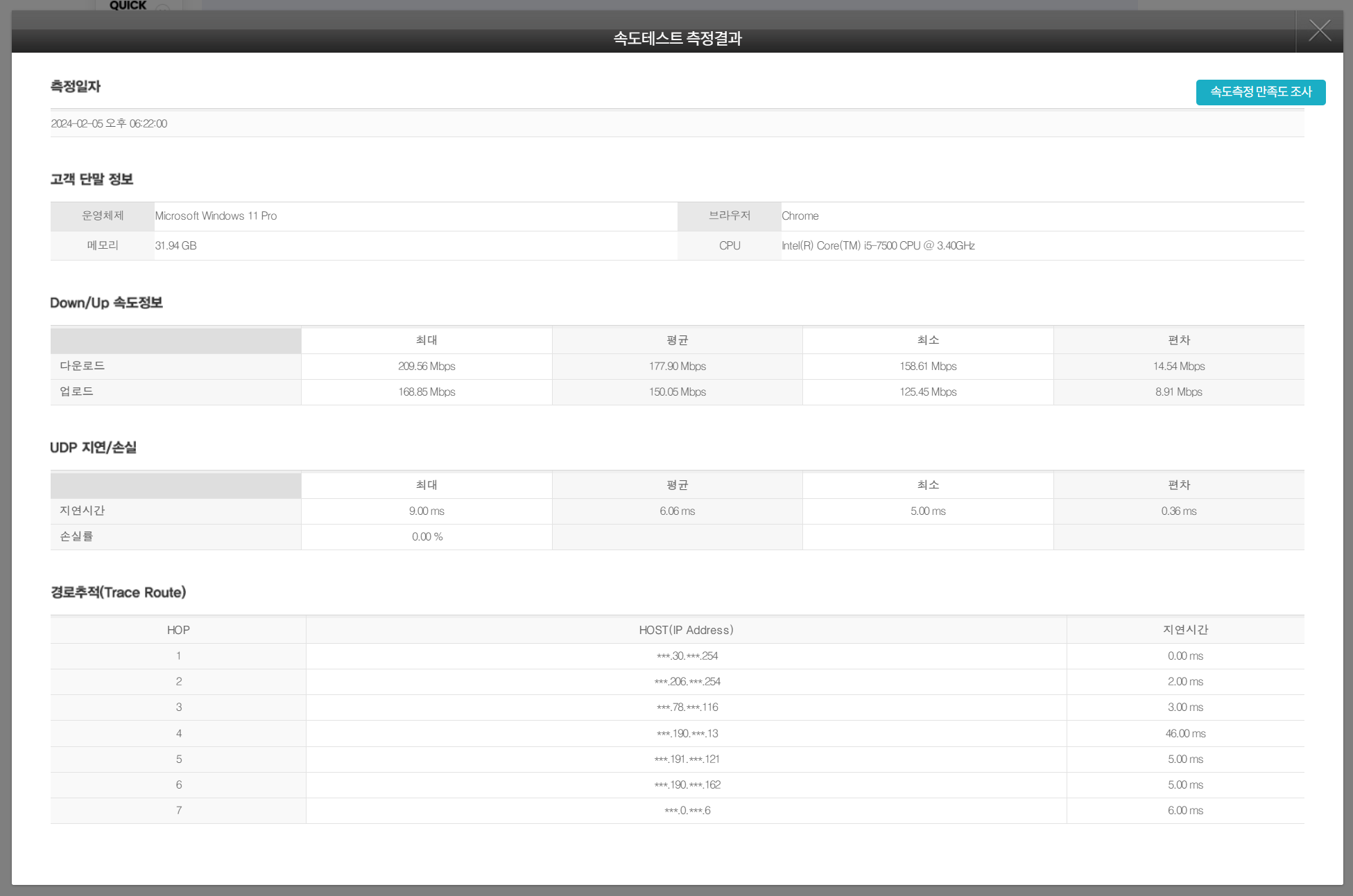 실성능은 어떨지 궁금해서 간단하게 속도측정을 해봤습니다. speedtest.net은 매 테스트 시마다 오차가 너무 커서 KT에서 제공하는 속도측정을 이용했습니다.