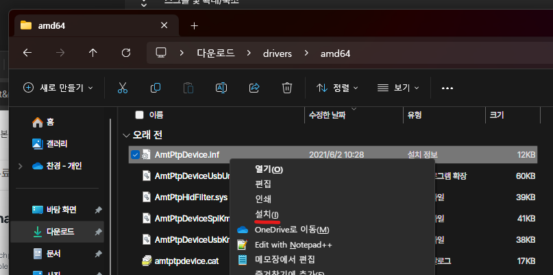 드라이버 설치는 매우 간단한데요, 다운받은 파일 중 AmtPtpDevice.inf를 우클릭하고 '설치'만 누르면 되었습니다.
