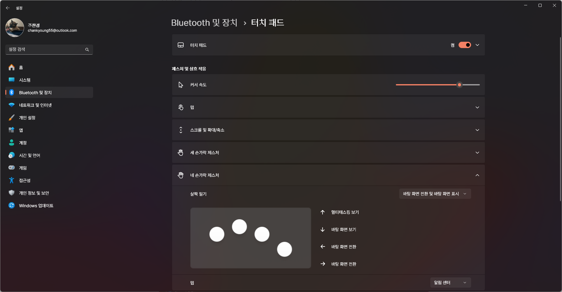 제스처 역시 Mac처럼 커스터마이징이 안 되고 Windows 설정을 따라가야 합니다.