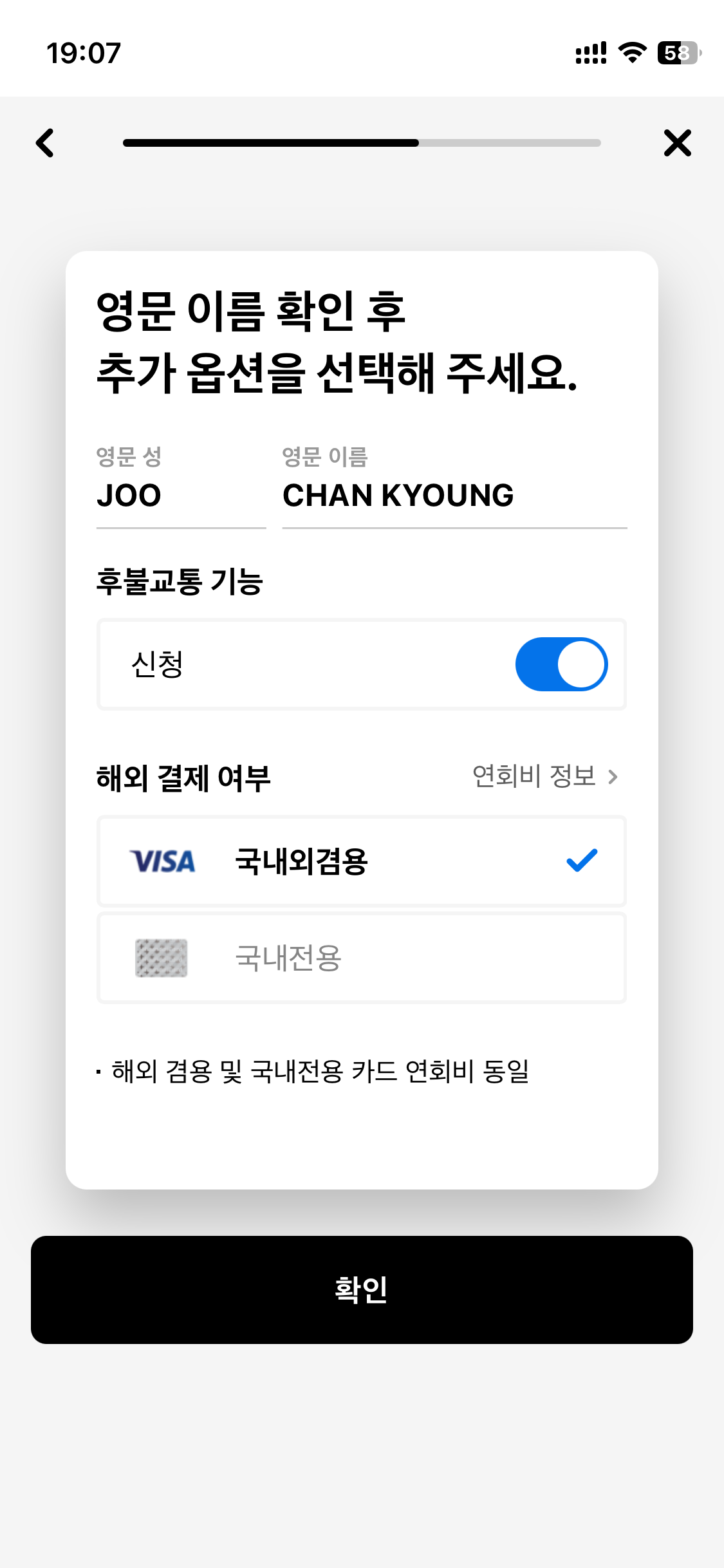 카드 디자인 선택 후 신청인 정보 입력, 본인인증, 약관 동의, 신분증 정보 입력까지 마치고 나면 영문 이름과 추가 옵션 선택이 나타납니다.
