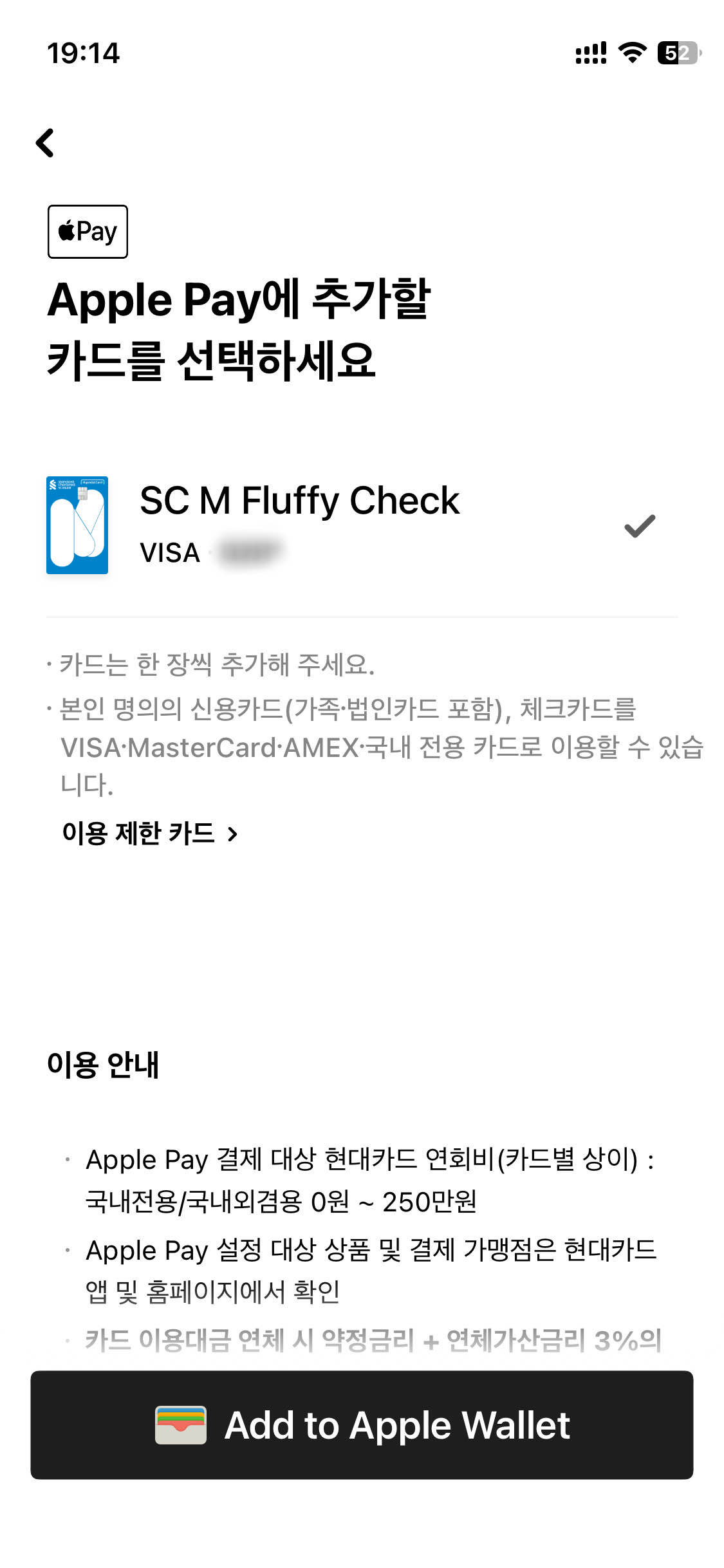 워치에 등록하려면 다시 현대카드 앱으로 돌아가 'Apple Pay에 카드 추가'를 하면 바로 추가할 수 있습니다.