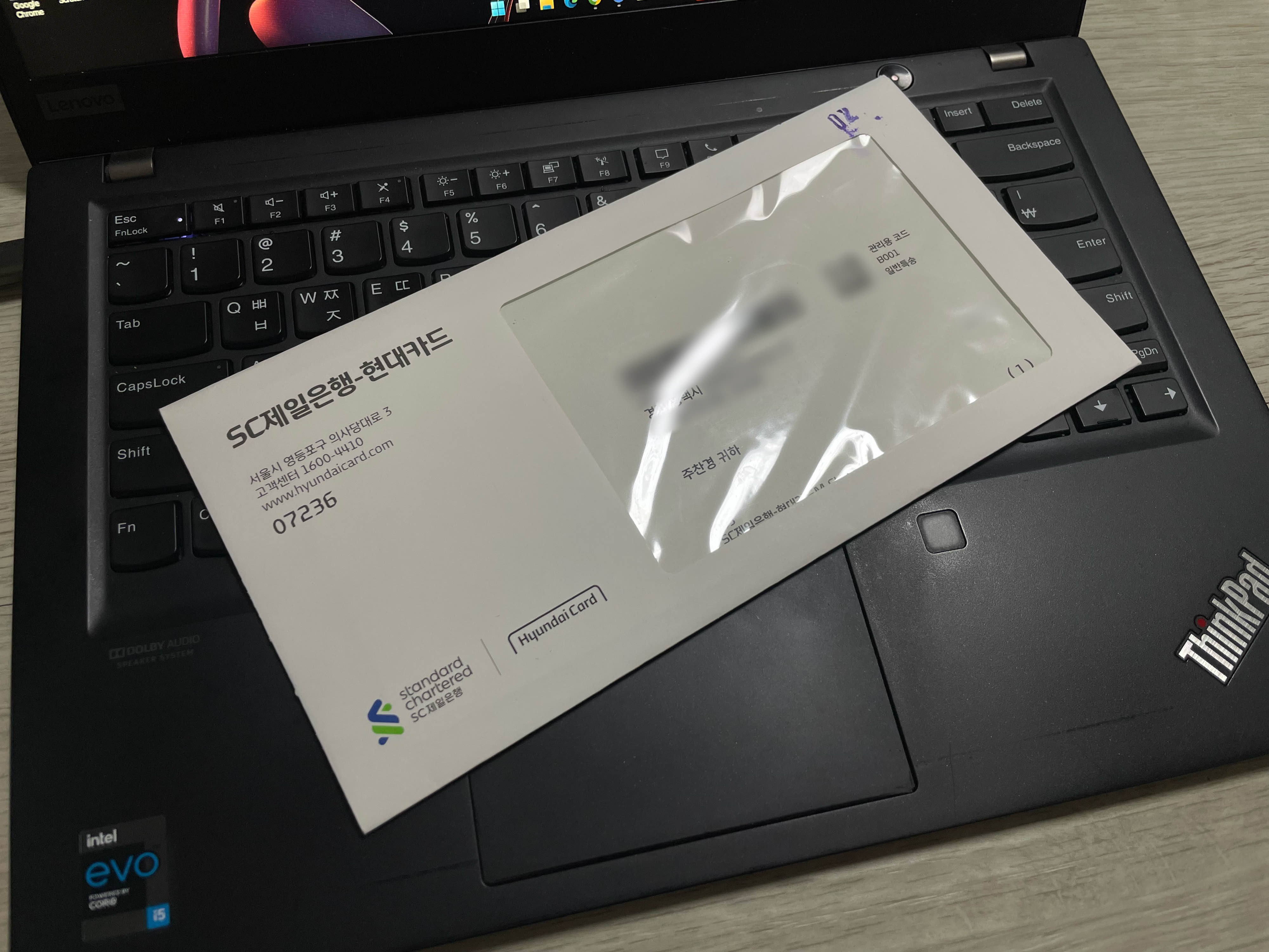 현대카드 구형 M시리즈 봉투에 담겨왔던 일반 M CHECK와 달리 SC제일은행 제휴카드 봉투에 담겨서 왔습니다.