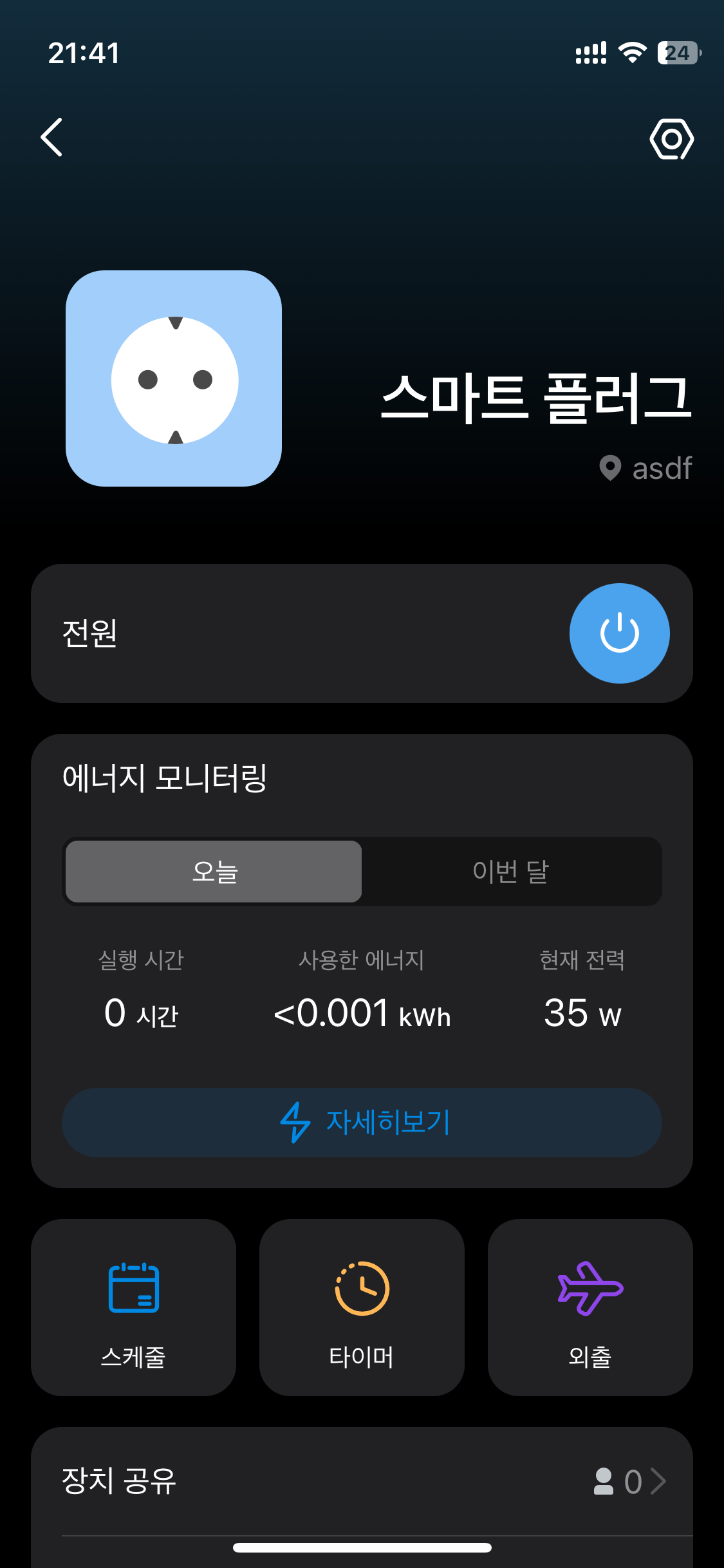 연결이 완료되면 이렇게 전원 원격제어와 에너지 모니터링 등 각종 기능을 사용할 수 있습니다.