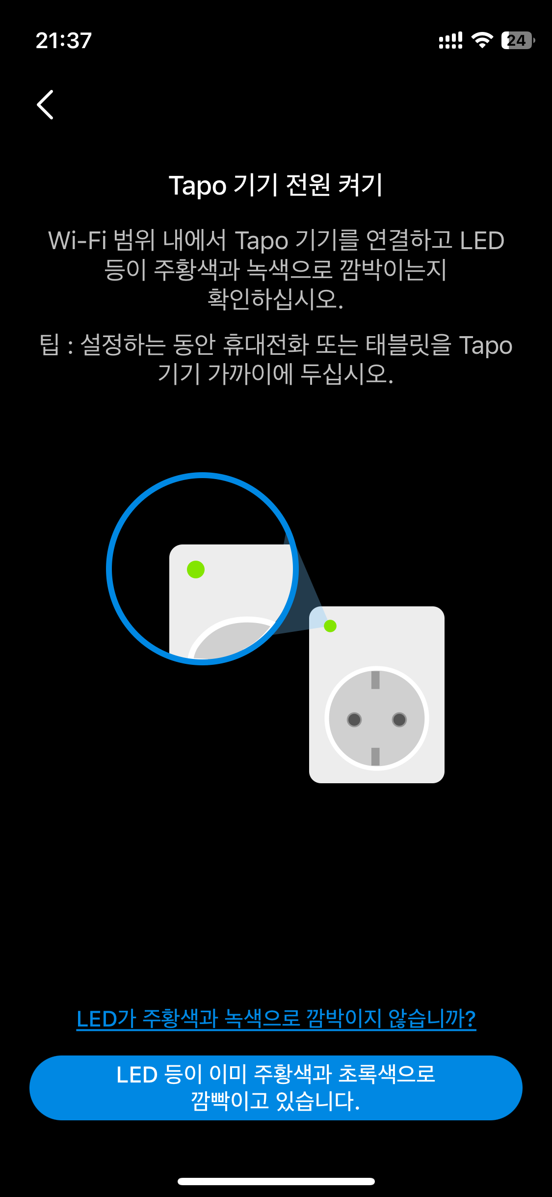 처음 사용 시 좌상단 LED가 녹색-황색으로 교차점멸하며 연결 대기중임을 알립니다.