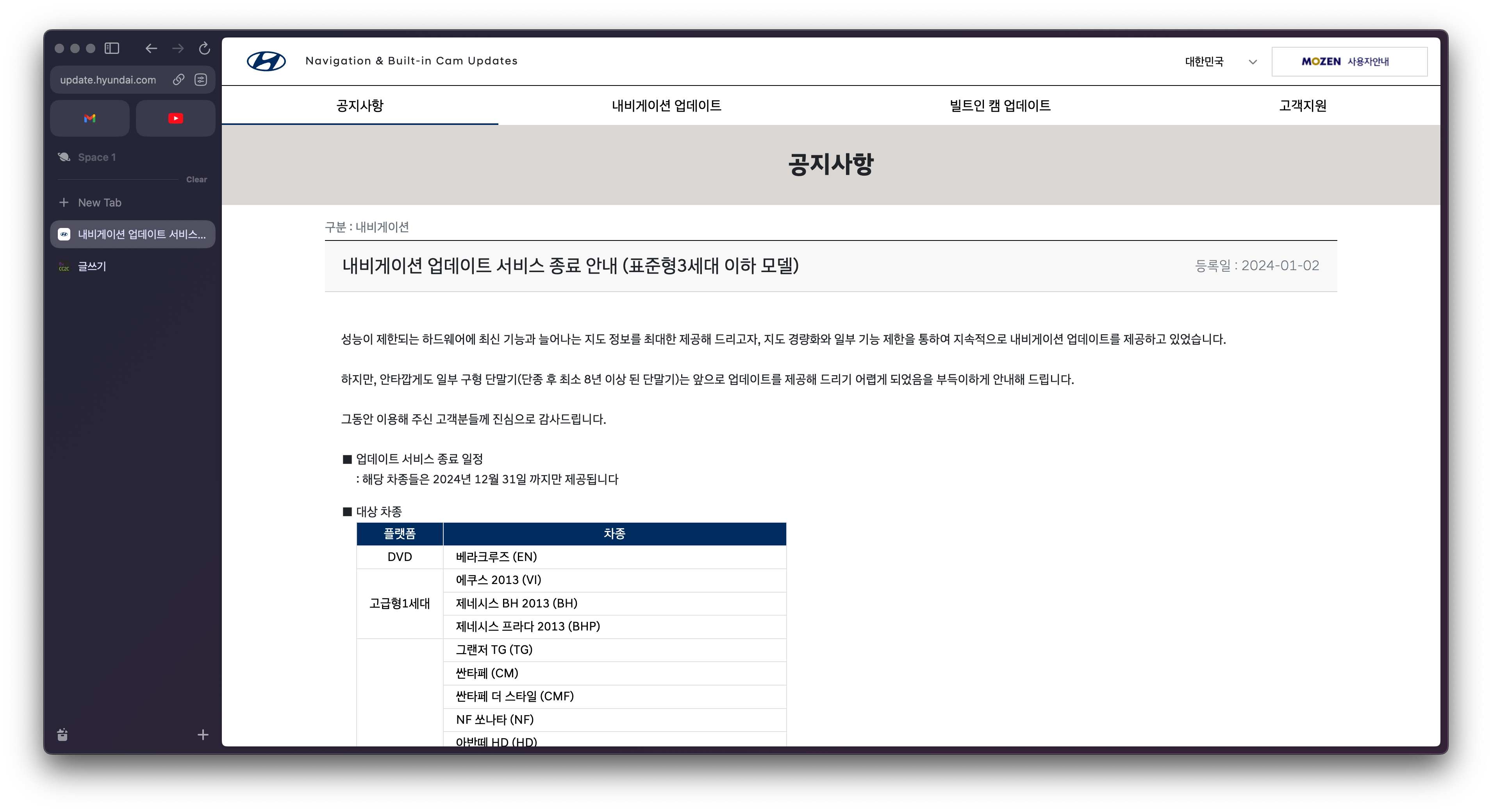 지난 1월, 현대자동차/기아 내비게이션 업데이트 홈페이지에 아래와 같은 공지가 올라왔습니다.