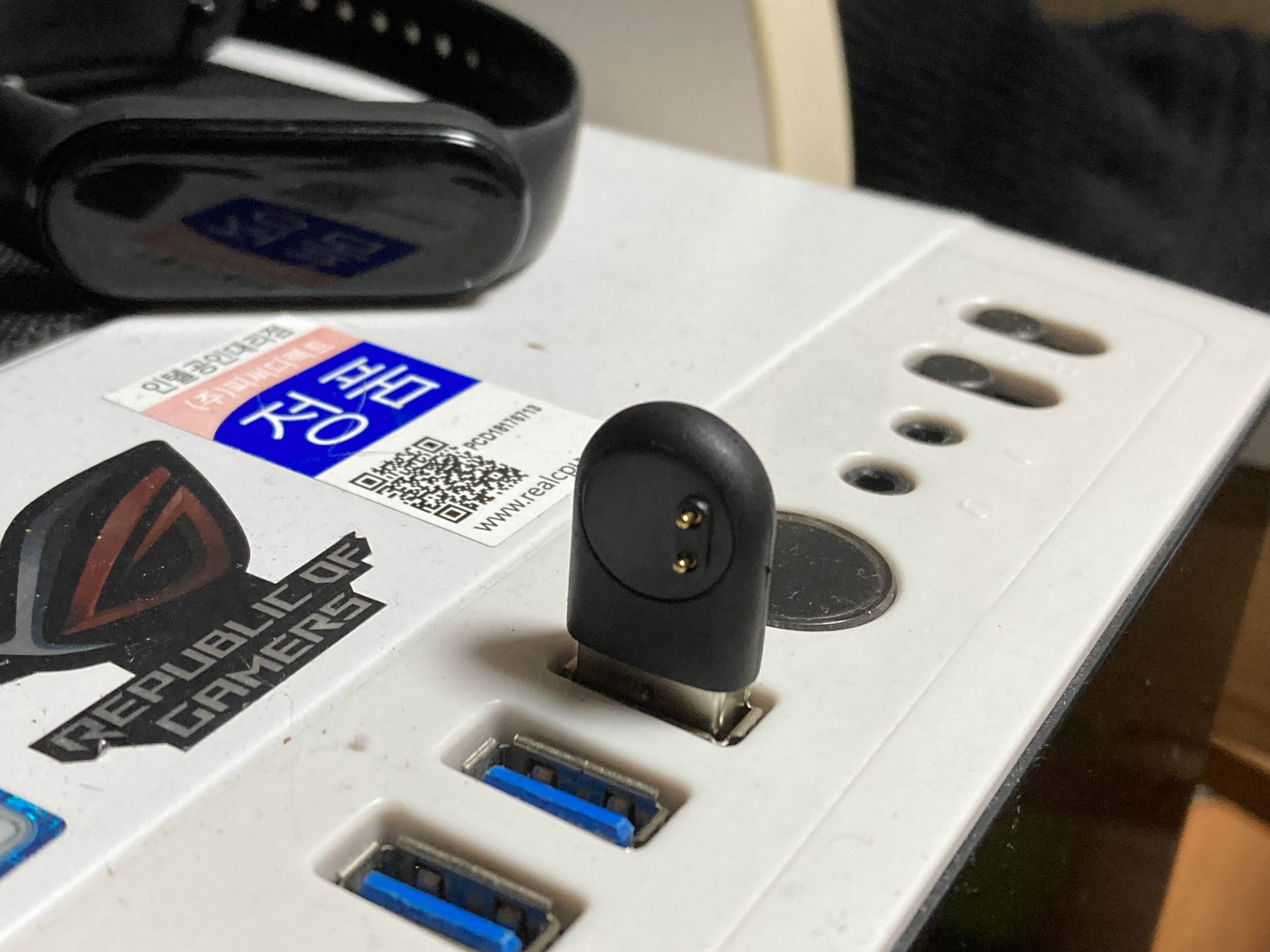 충전 단자는 여전히 포고핀이지만, 미밴드 8부터 기존의 원형 충전 케이블이 아닌 흰색 사각형 충전 케이블로 변경되었습니다.