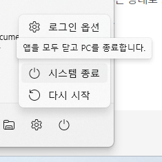 우선 노트북을 종료합니다. 이 때, Shift 키를 누른 상태로 시작 메뉴에서 시스템 종료를 눌러줍니다. 또는 다시 시작을 눌러주세요.
