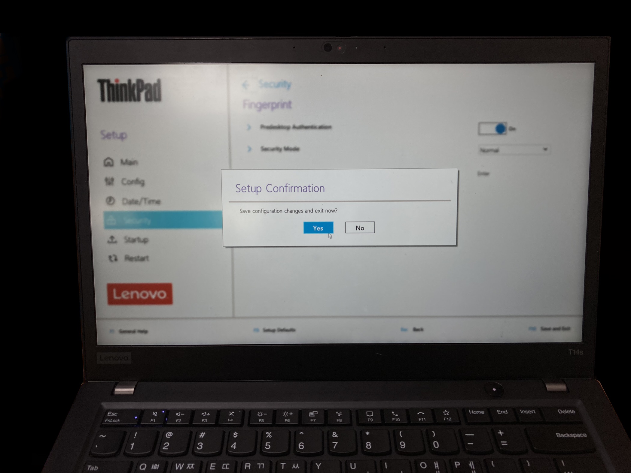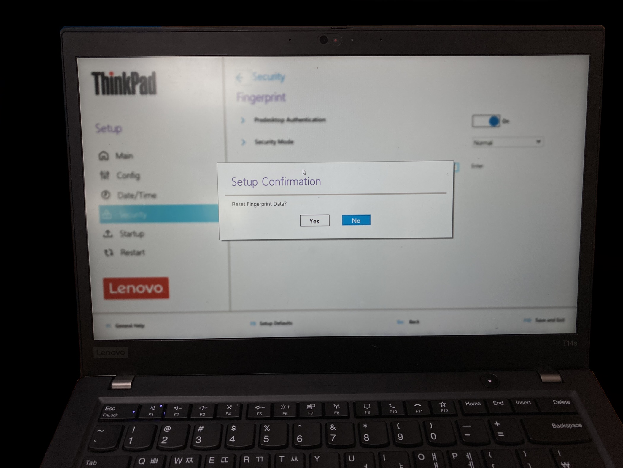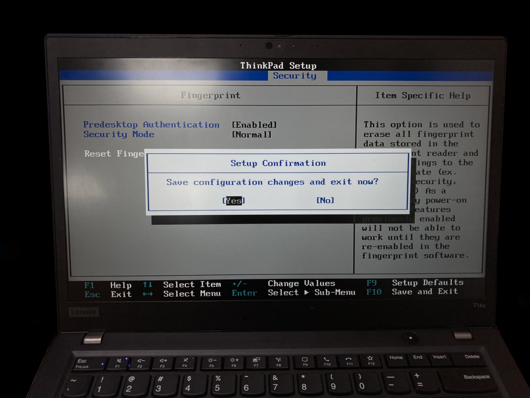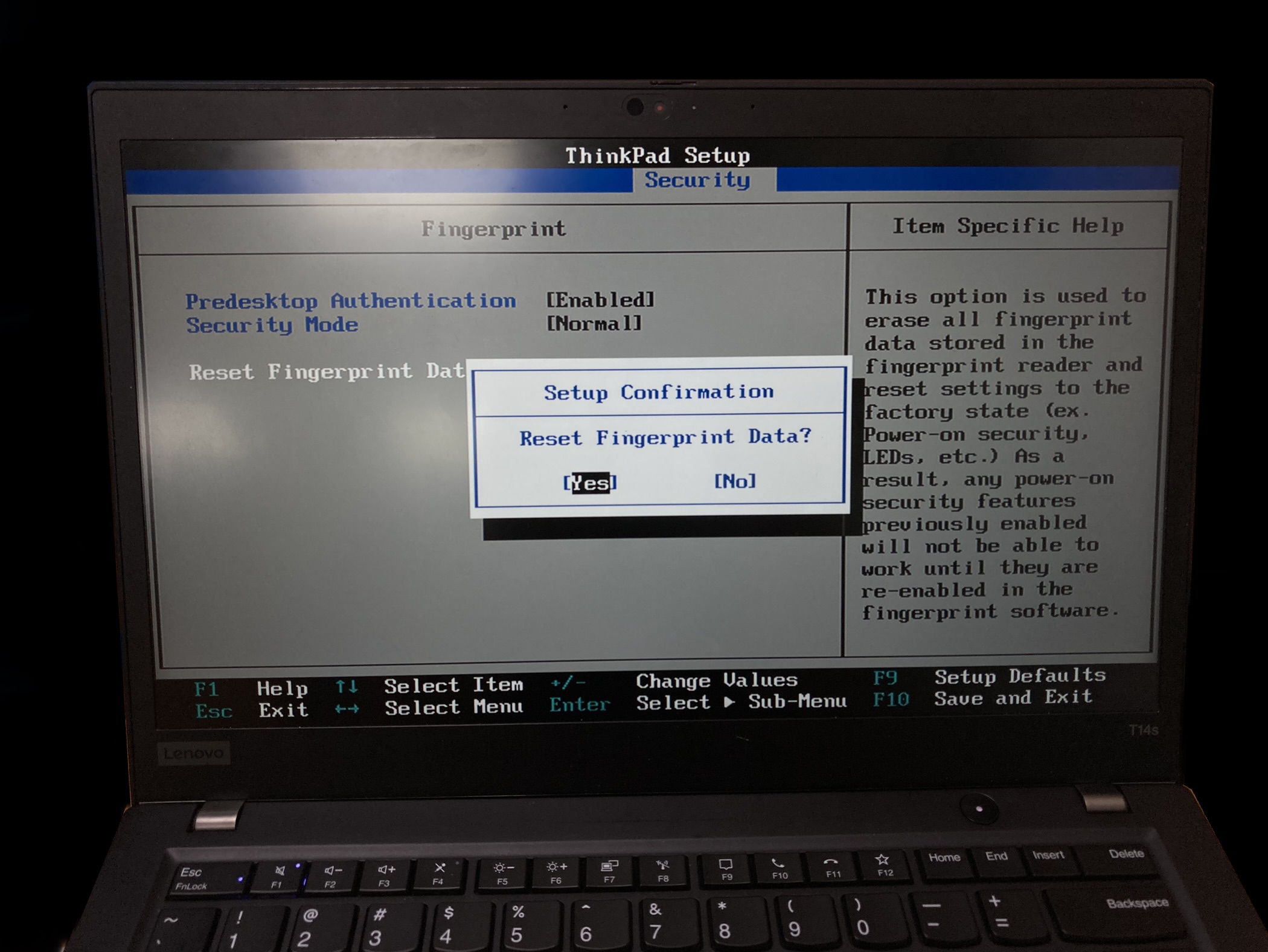 지문 데이터를 초기화하겠냐고 다시 묻습니다. Yes를 눌러줍니다.
