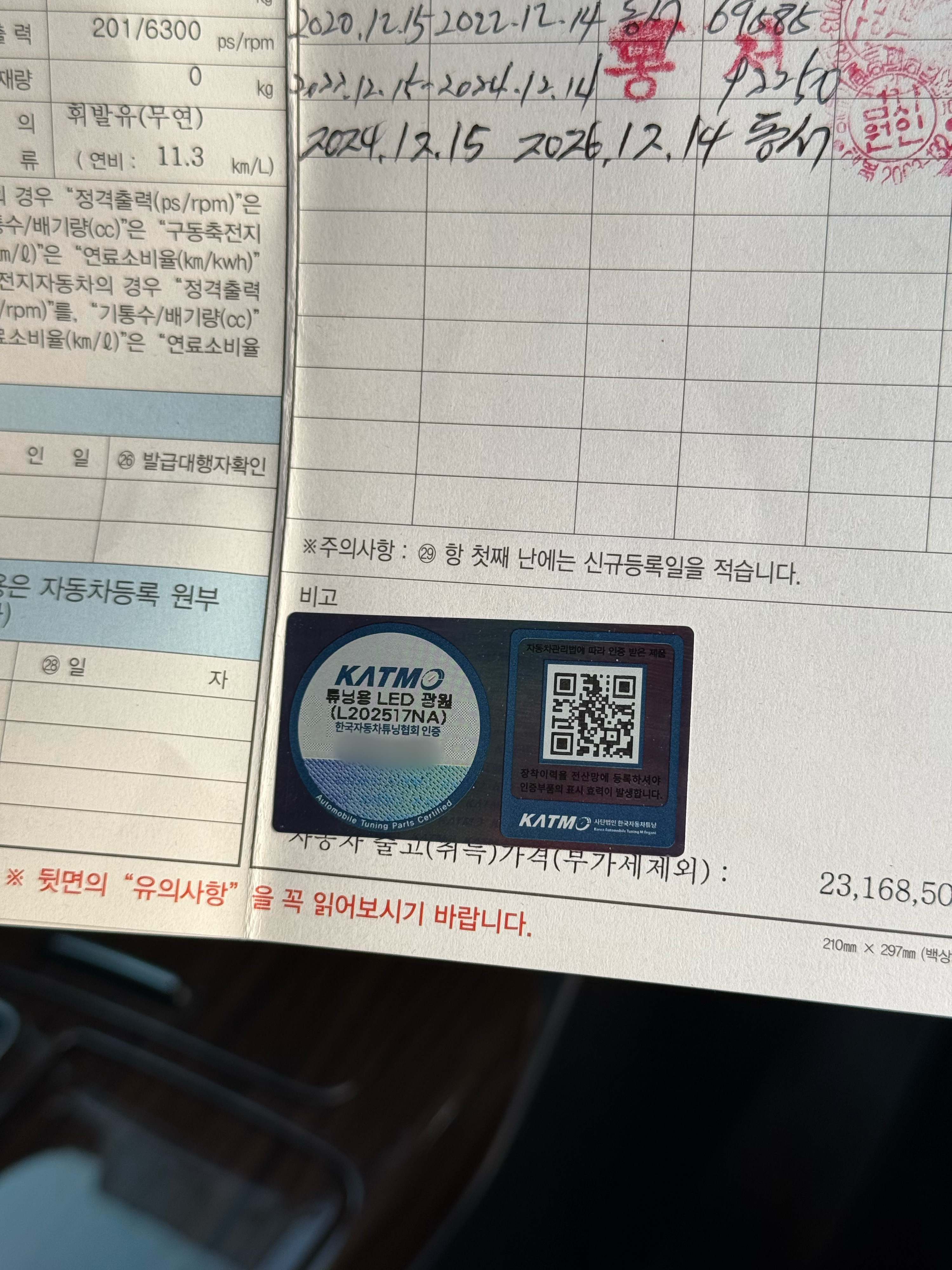 튜닝인증 사이트 등록 후 자동차등록증에 스티커까지 붙이면 끝.