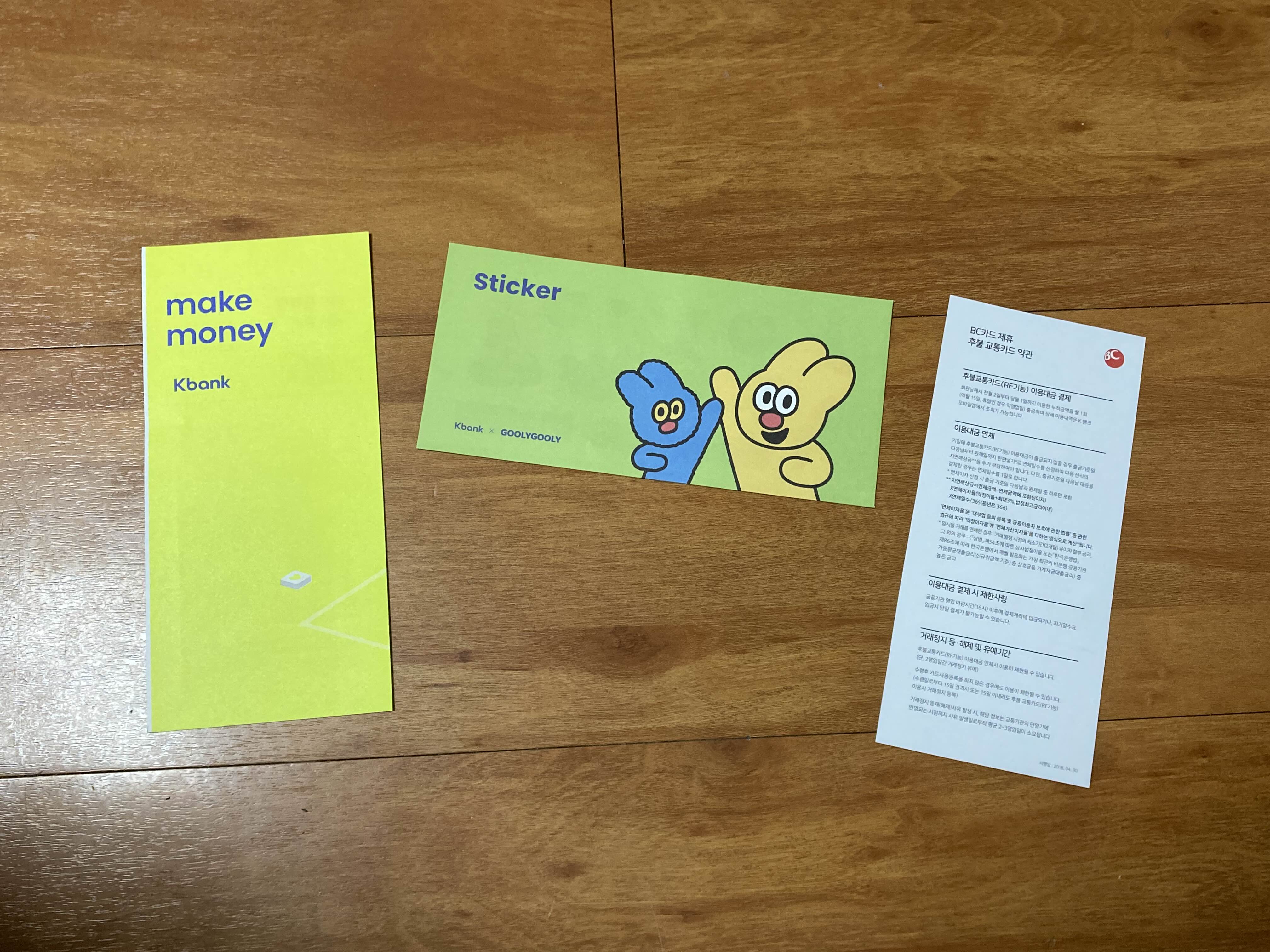 카드 하나, 스티커, 그리고 후불교통카드 약관이 있습니다.