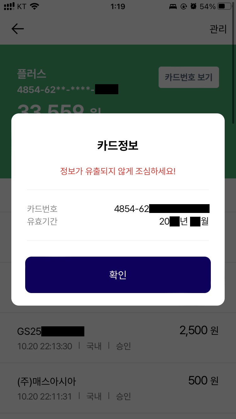 실물 카드를 발급하지 않았거나 아직 배송받지 않았다면 카드 CVC까지 표시되며, 실물 카드 사용등록이 된 경우 CVC는 표시되지 않습니다.