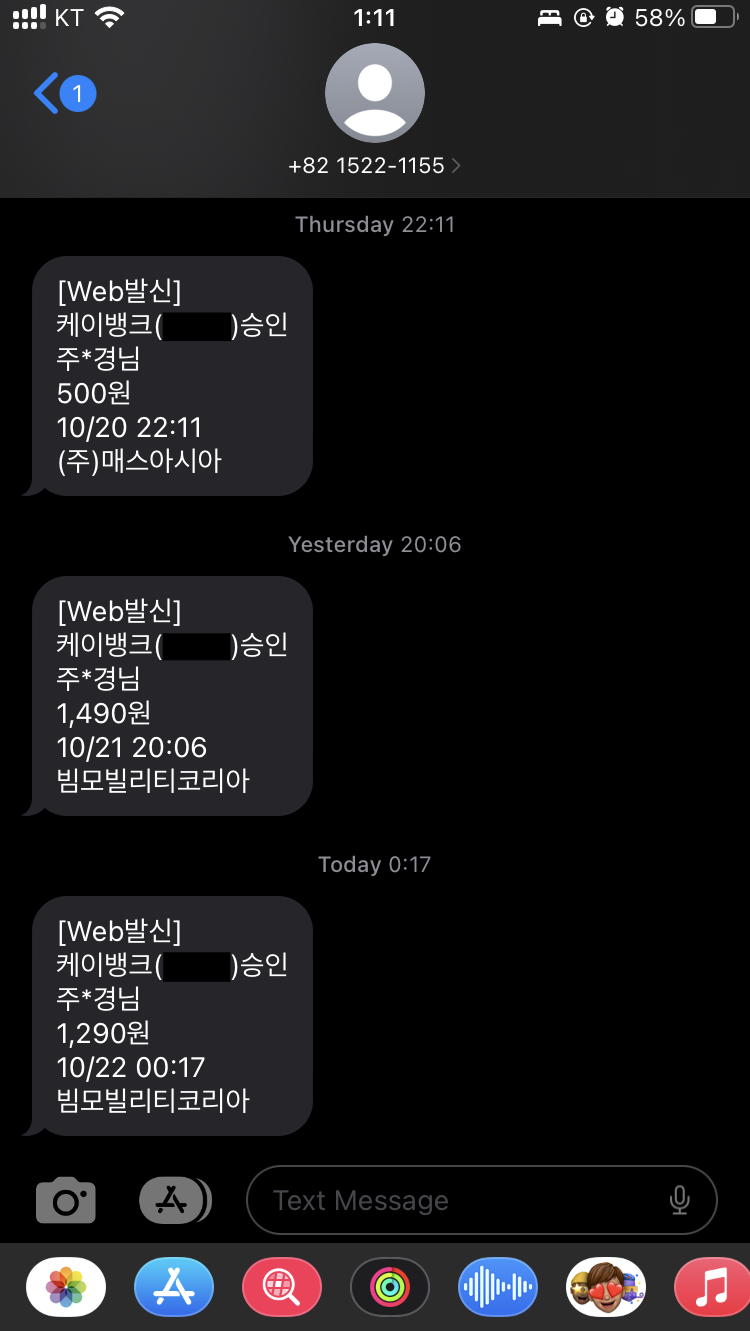 그리고 이건 케이뱅크 체크카드만 이러는지 모르겠는데, 분명 알림 설정을 5만원 이상 SMS로 설정해놨음에도 온라인 결제 시에는 금액 상관 없이 무조건 SMS로 날라옵니다.