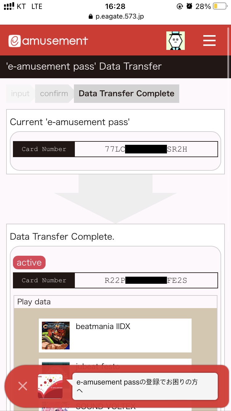‘데이터 이전에 대하여’를 누르면 태그했던 카드의 이어뮤 카드 번호가 뜹니다. Suica나 PASMO 등 호환 카드에 기재된 카드 번호와는 다른 이어뮤 전용 카드 번호입니다.