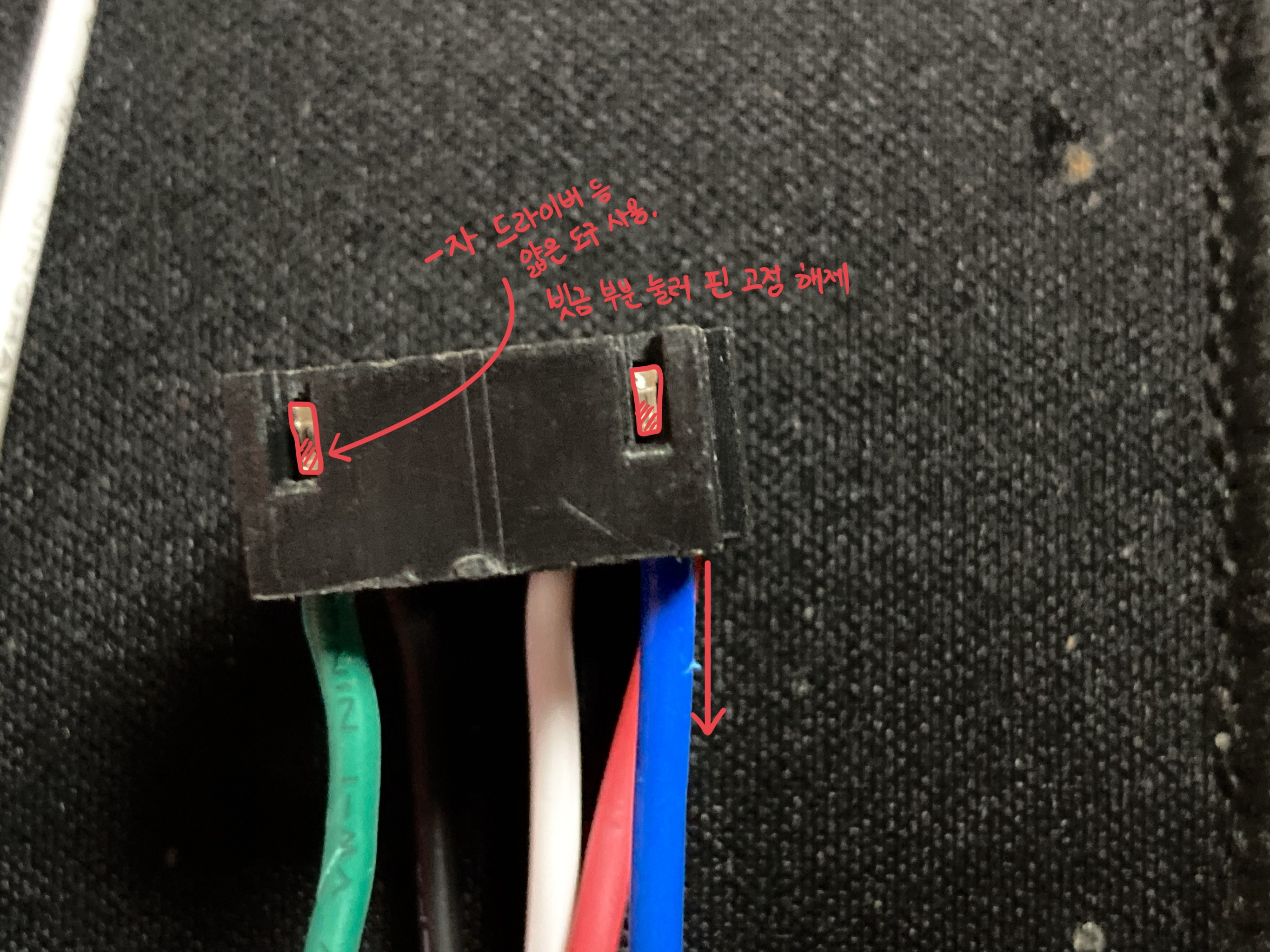 사진의 빗금 친 부분을 일자드라이버 등으로 누르고, 화살표 방향으로 배선을 뽑으면 쉽게 빠집니다.