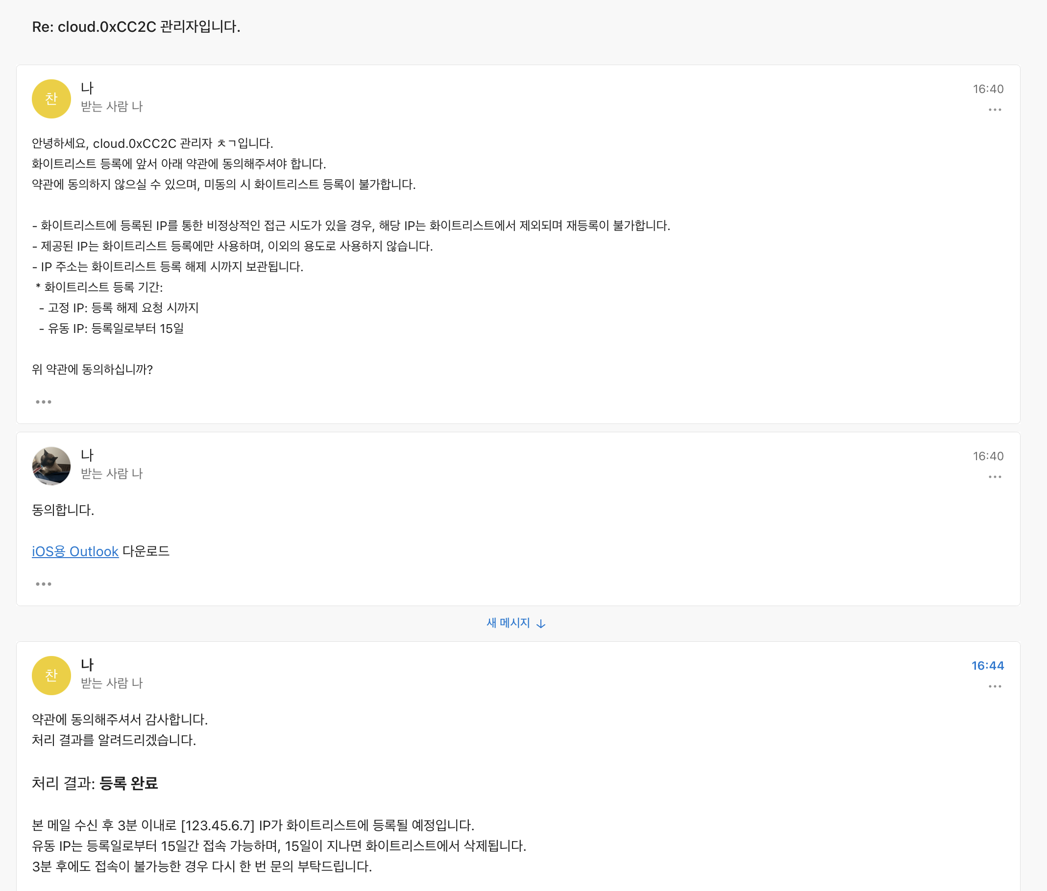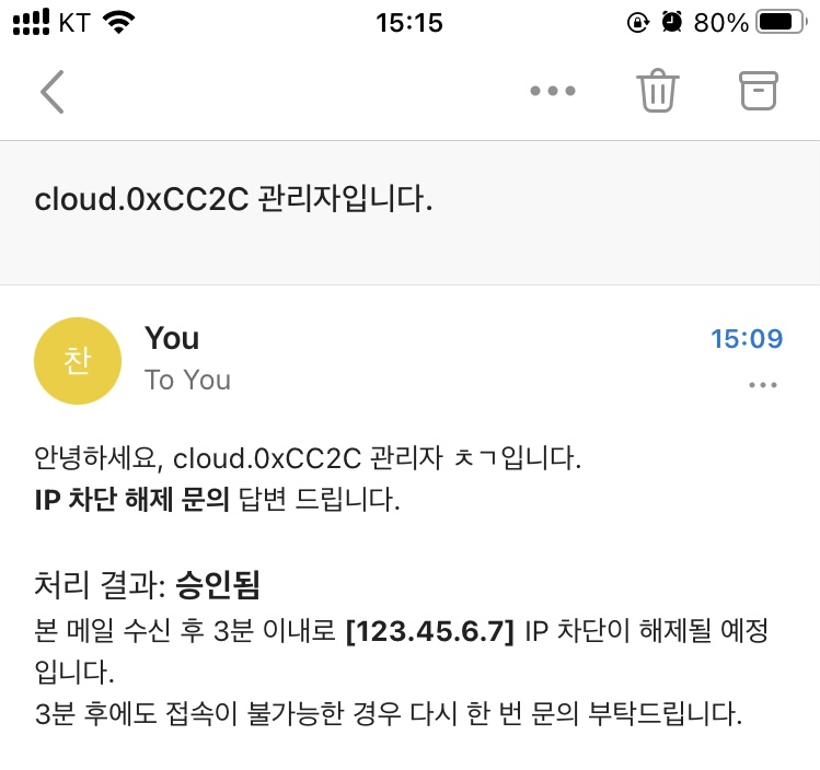 IP 차단 해제 요청이 들어오면, 서버 접속 로그 확인 후 처리 결과를 메일로 보내드립니다.