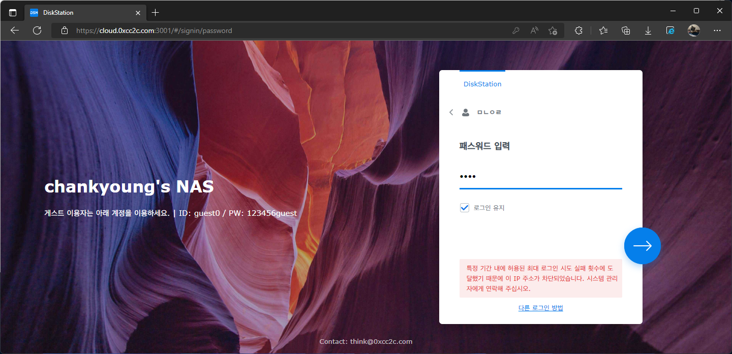 로그인 횟수 초과로 IP가 차단되었다면, think@0xcc2c.com 으로 차단된 IP주소를 보내주세요.