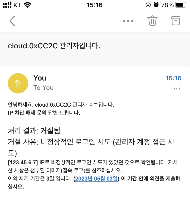 IP 차단 해제 요청이 들어오면, 서버 접속 로그 확인 후 처리 결과를 메일로 보내드립니다.