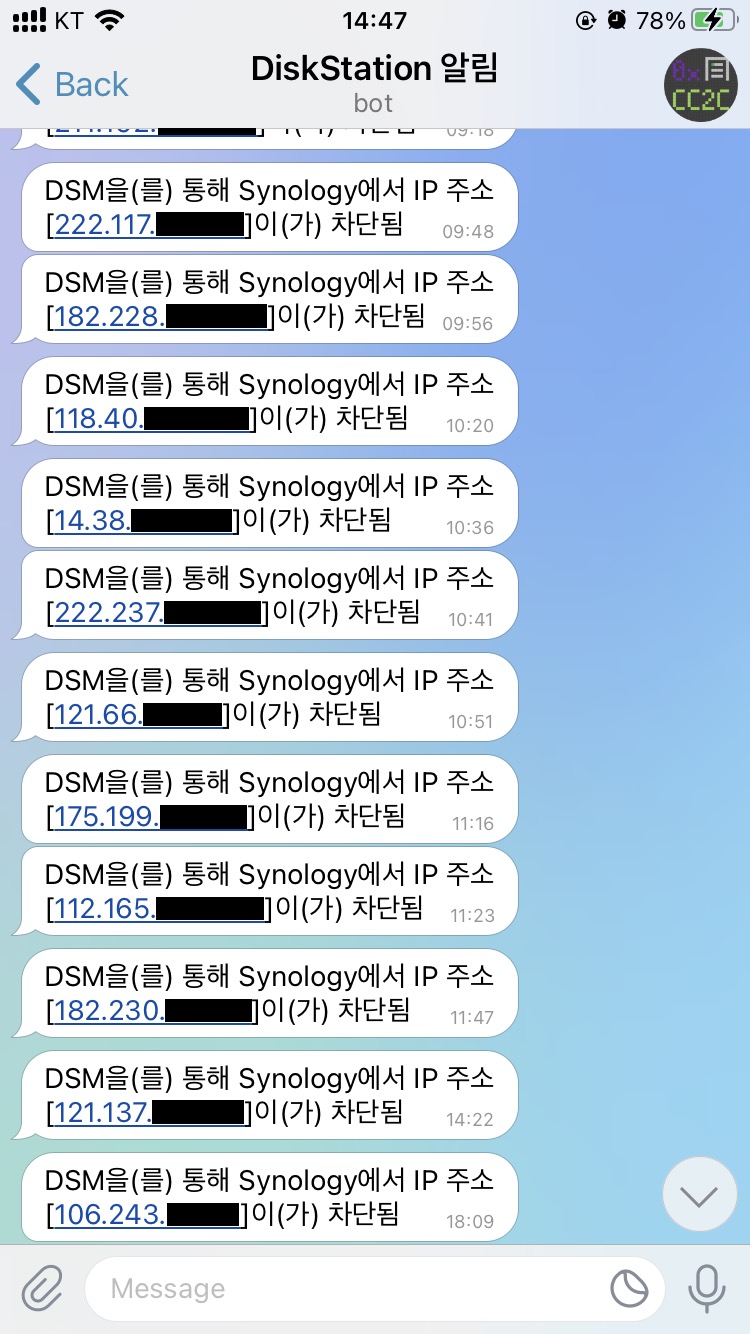 cloud.0xCC2C는 특정 시간 이내 여러 차례 로그인에 실패하면 해당 IP를 자동으로 차단하며, 관리자에게 IP가 차단되었음을 알리는 메시지가 발송됩니다.