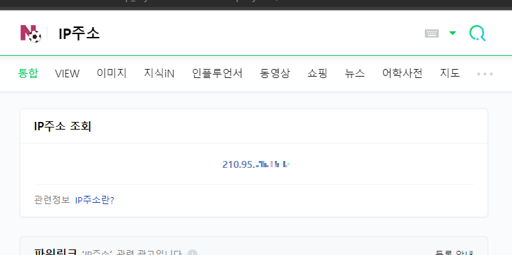 네이버에 'IP 주소' 를 검색하면 아래와 같이 본인의 IP를 조회할 수 있습니다.