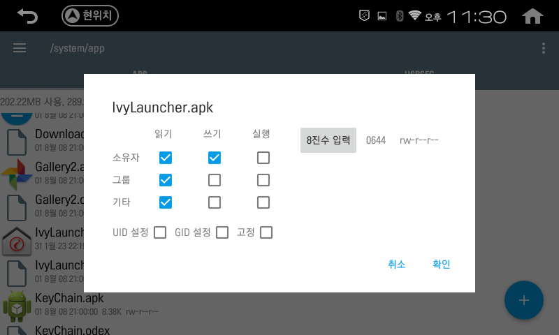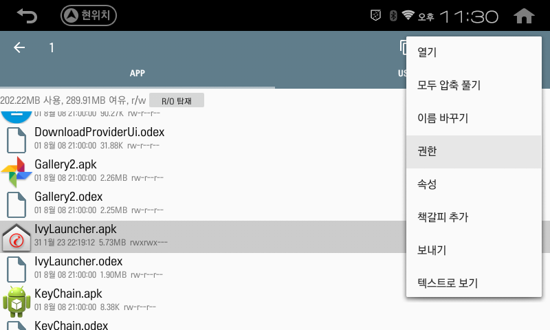붙여넣은 런처 APK를 다시 꾹 누르고, 상단 메뉴에서 권한 메뉴를 눌러줍니다.