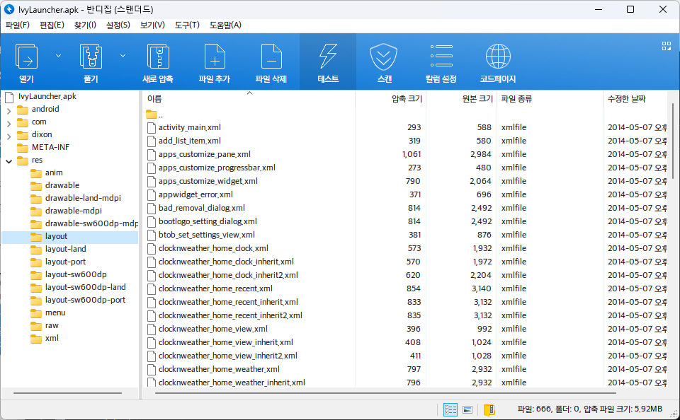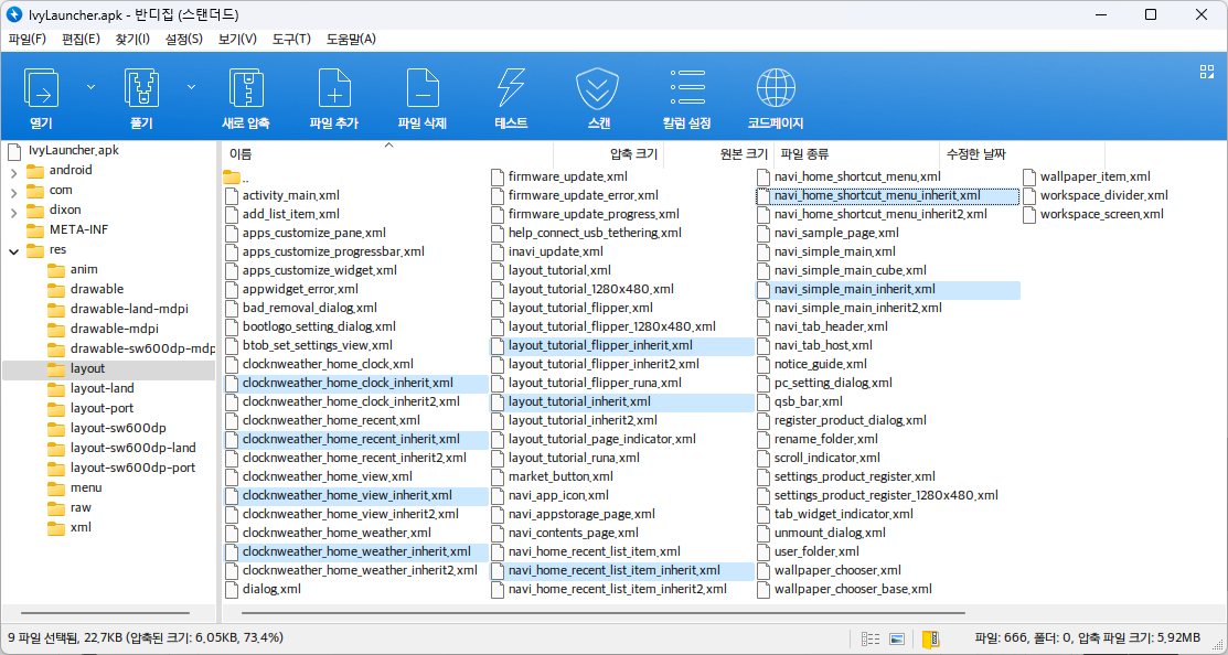 꺼낸 런처 APK를 반디집으로 열고, res\layout 폴더로 들어갑니다.
