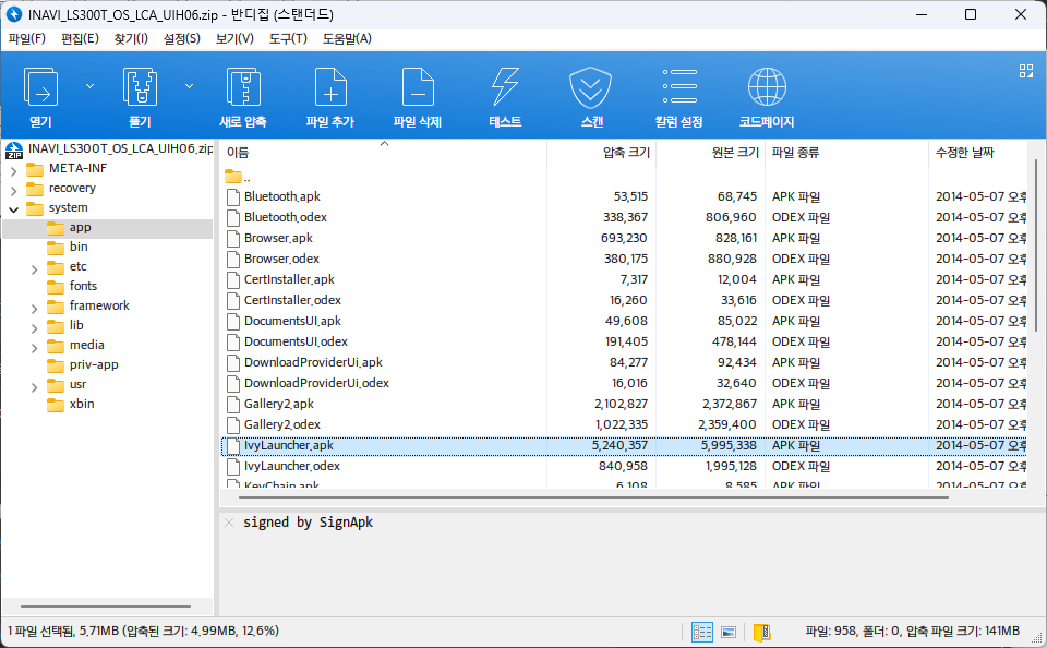 펌웨어 파일을 반디집으로 열고, system\app\IvyLauncher.apk를 꺼내주세요.