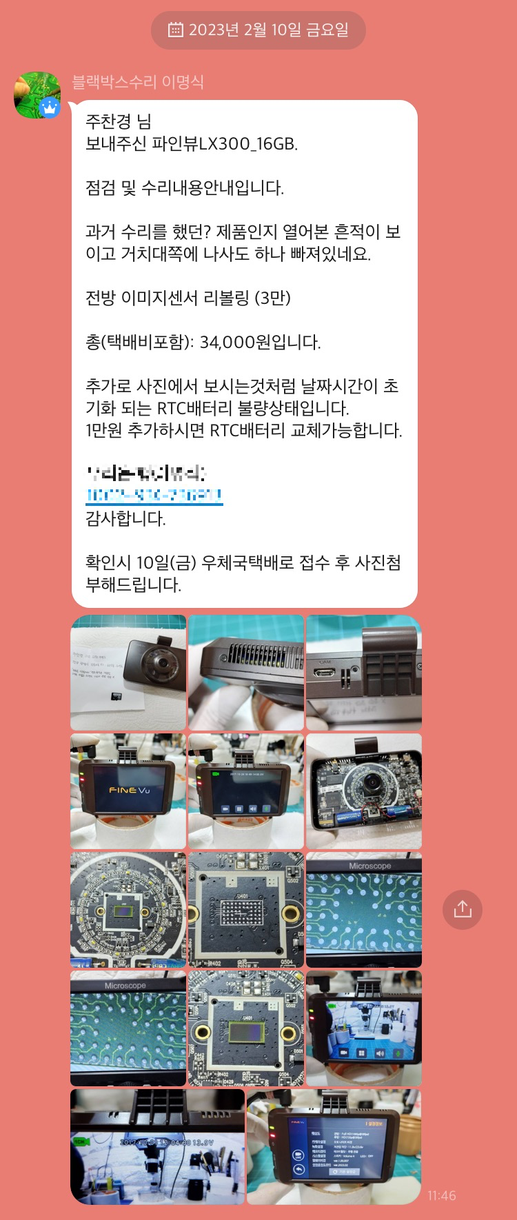 발송 후 며칠 뒤에 카톡이 왔습니다. 수리 진행 상황 촬영 사진과 함께 추가로 수리가 필요한 부분도 안내해주셨습니다.