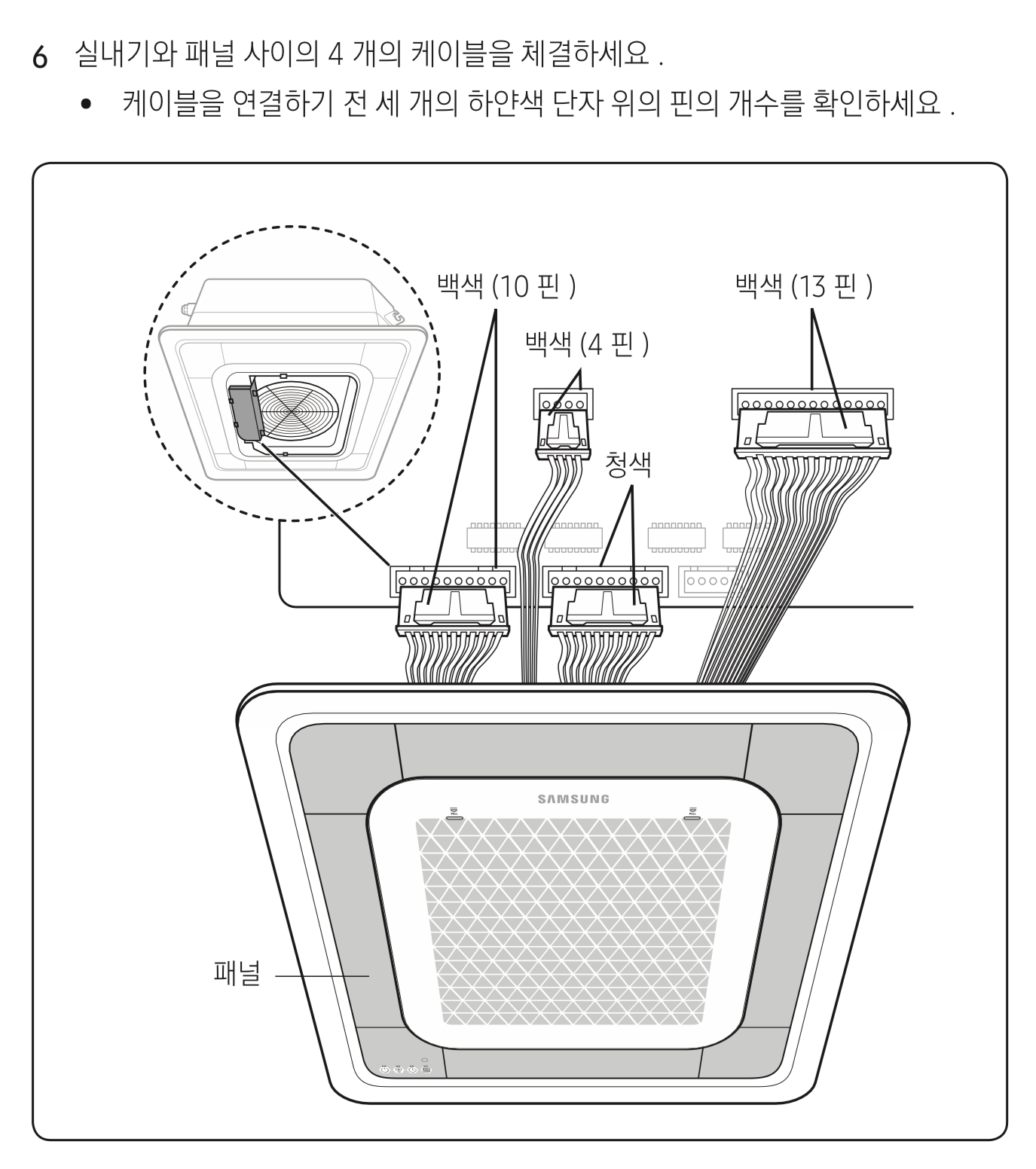 - PC4NUSK1N 패널은 설치 안내서의 내용(11(백)+10(청)+13(백))과 달리 10(백)+10(청)+13(백)커넥터를 사용한다. (단 구통신용 PC4N**K1 패널은 다를 수 있음)