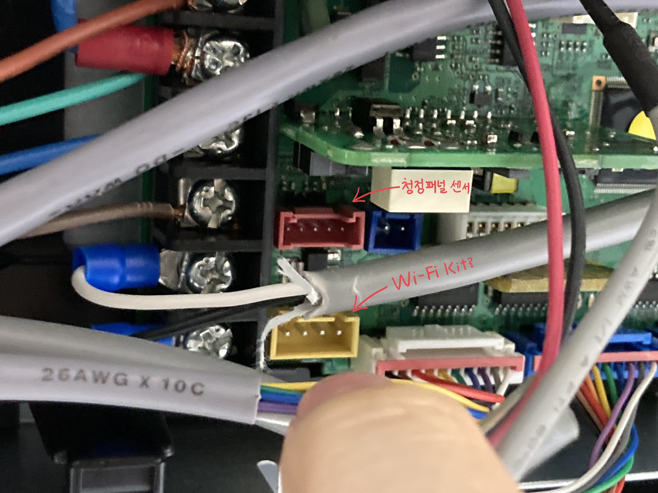 10핀 백색 커넥터 왼쪽으로는 Wi-Fi Kit 연결 단자로 추정되는 노란색 커넥터와 그 위로 청정 패널용 적색 5핀 커넥터가 보입니다.