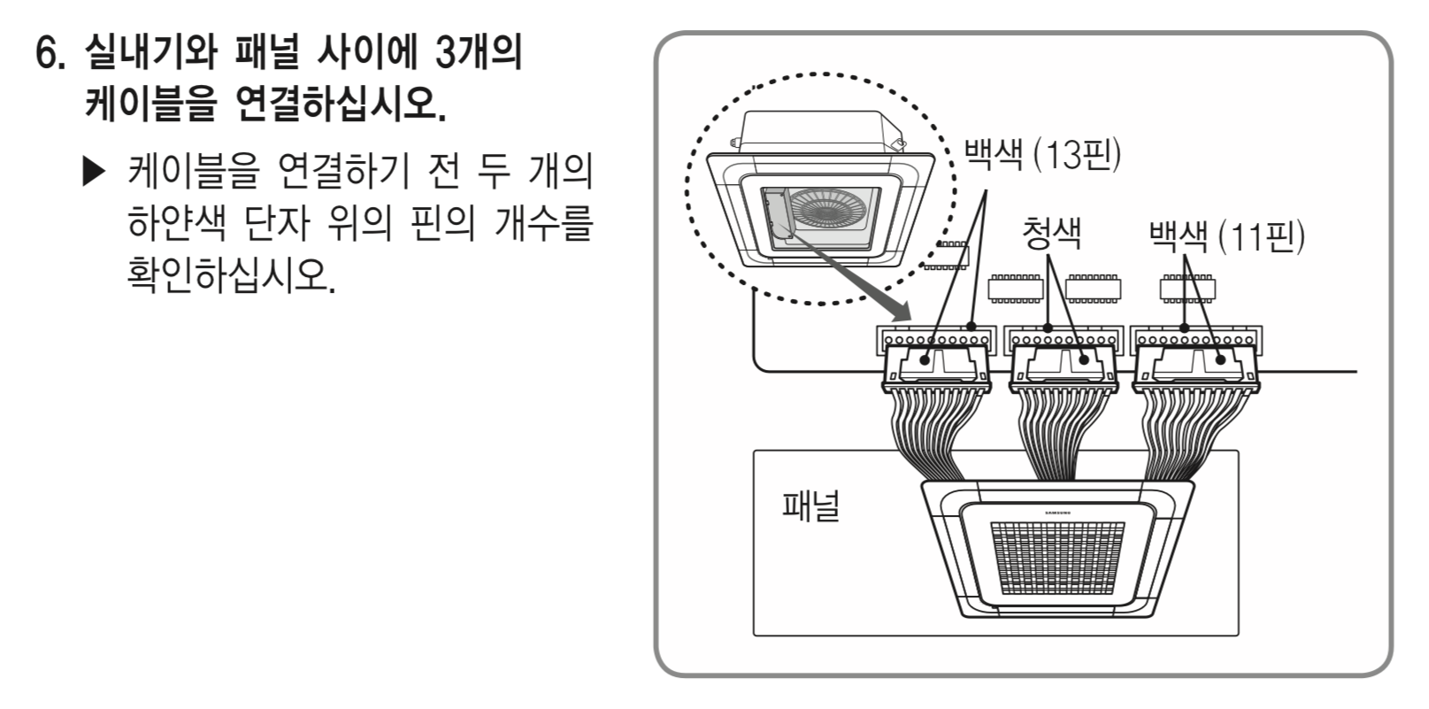 - PC4NUSK1N 패널은 설치 안내서의 내용(11(백)+10(청)+13(백))과 달리 10(백)+10(청)+13(백)커넥터를 사용한다. (단 구통신용 PC4N**K1 패널은 다를 수 있음)
