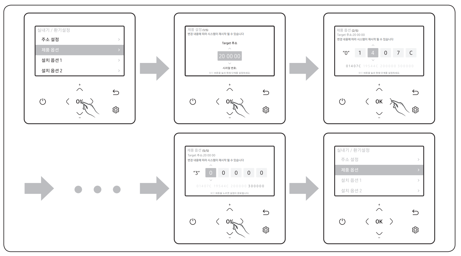 아래 그림은 제품 용량 옵션 입력 과정입니다. 6자리씩 입력하며, OK 버튼을 눌러 다음 페이지로 넘어갈 수 있습니다. 3페이지에서 OK를 누르면 설정이 저장됩니다.