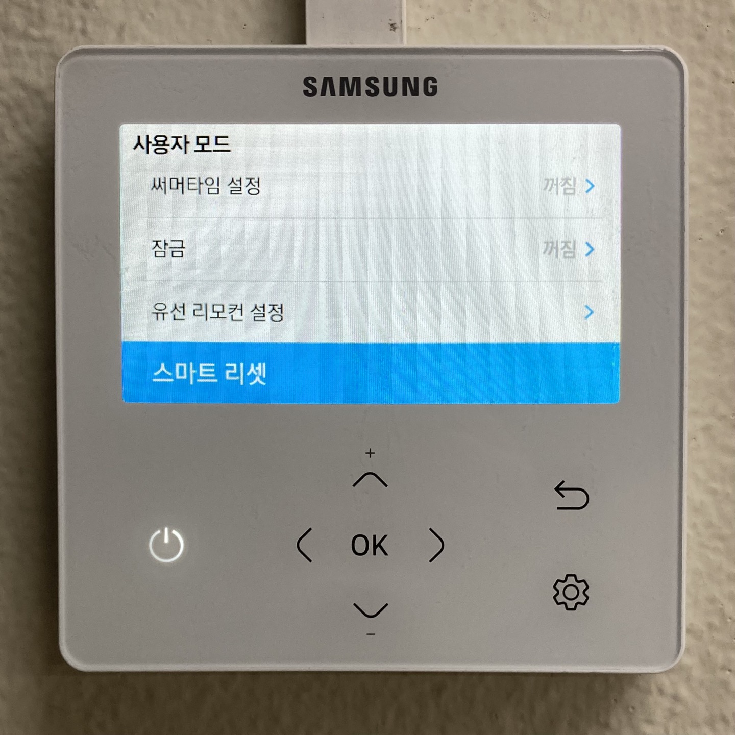 ⑥ 리모컨의 설정 - 부가기능 - 사용자 모드 - 스마트 리셋 선택해주세요. 에어컨이 리셋됩니다.
