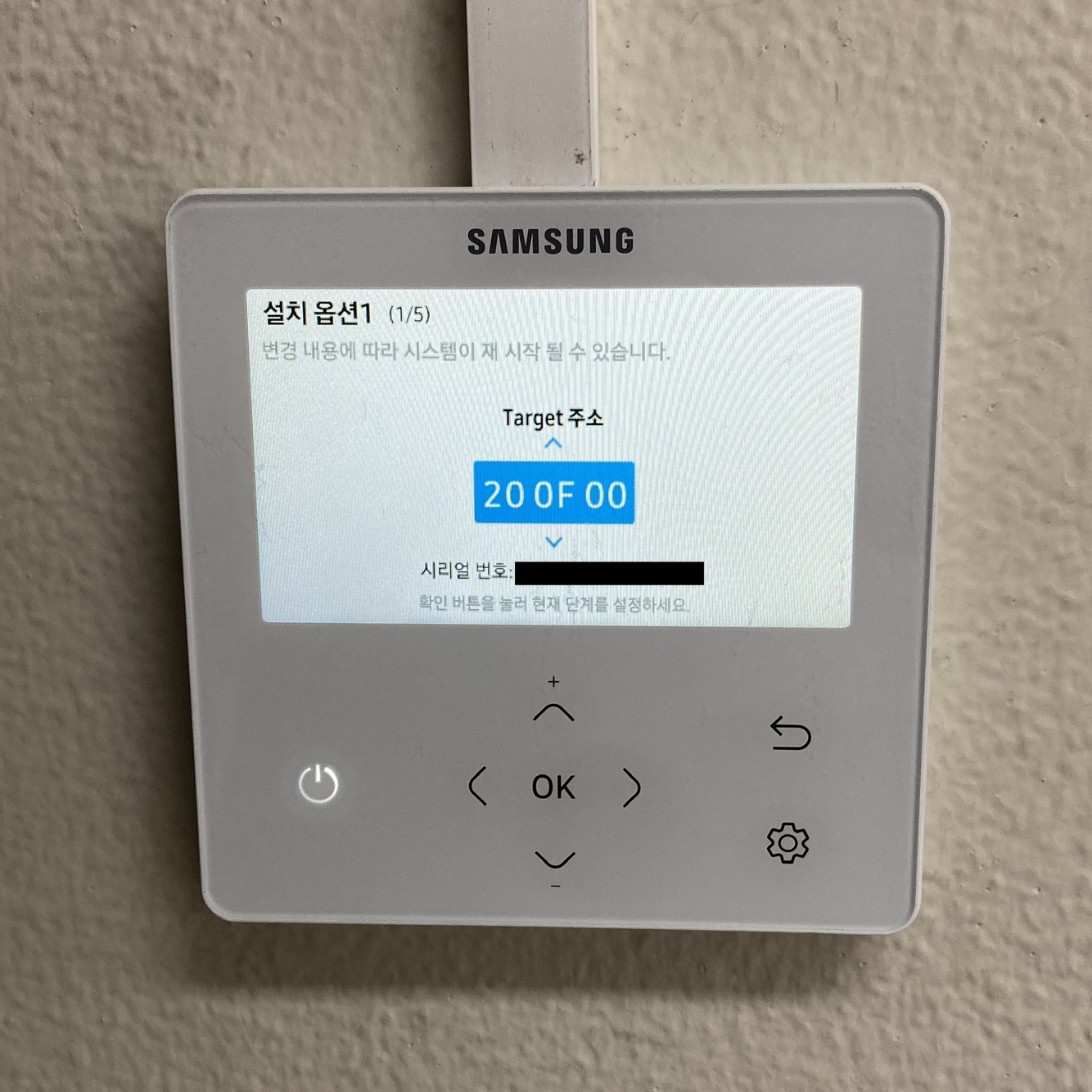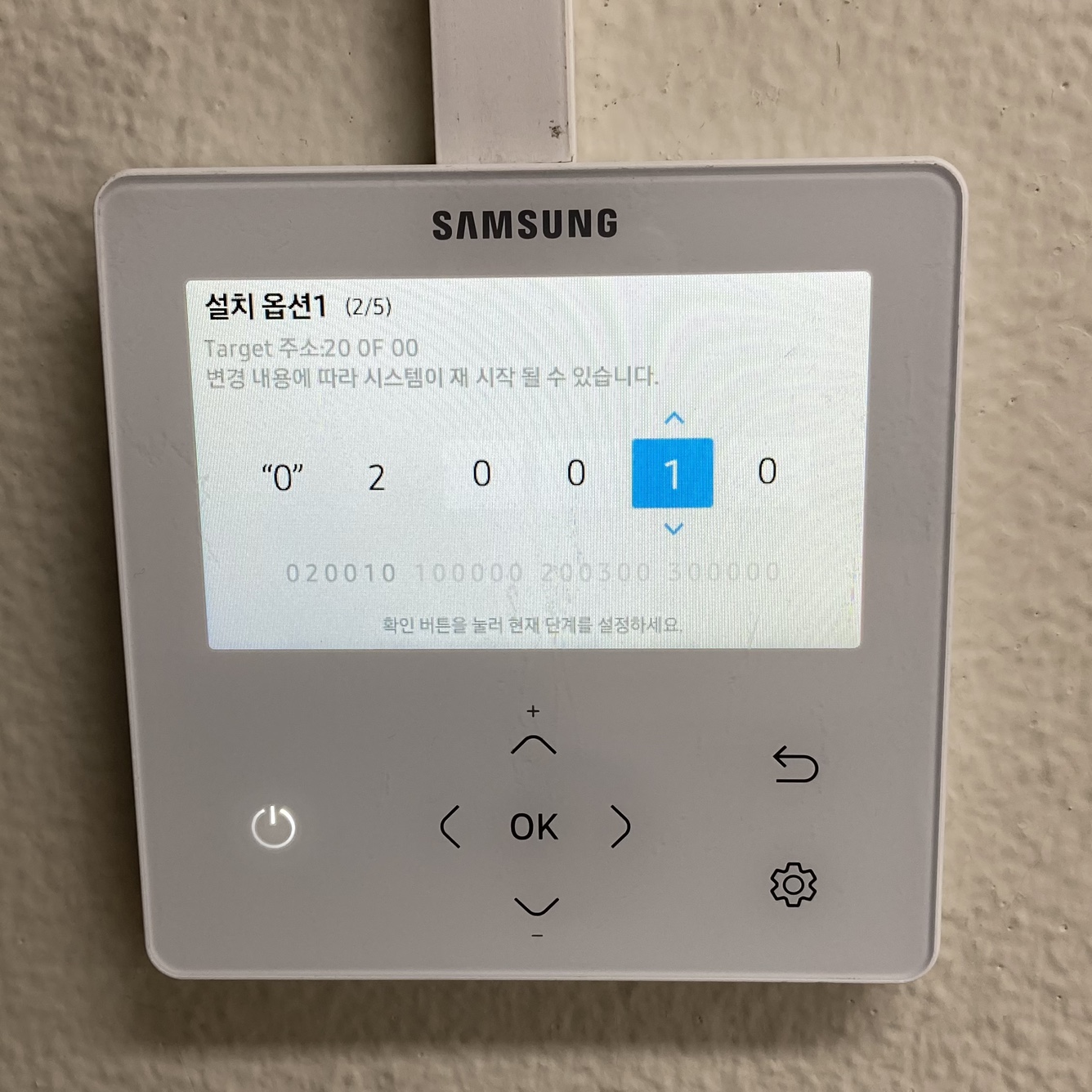 ④ 옵션을 설정할 실내기 주소를 선택합니다. 리모컨에 실내기가 두 대 이상 연결되어 있다면 위/아래 방향키로 실내기를 선택할 수 있습니다. 확인을 누르면 다음으로 넘어갑니다.