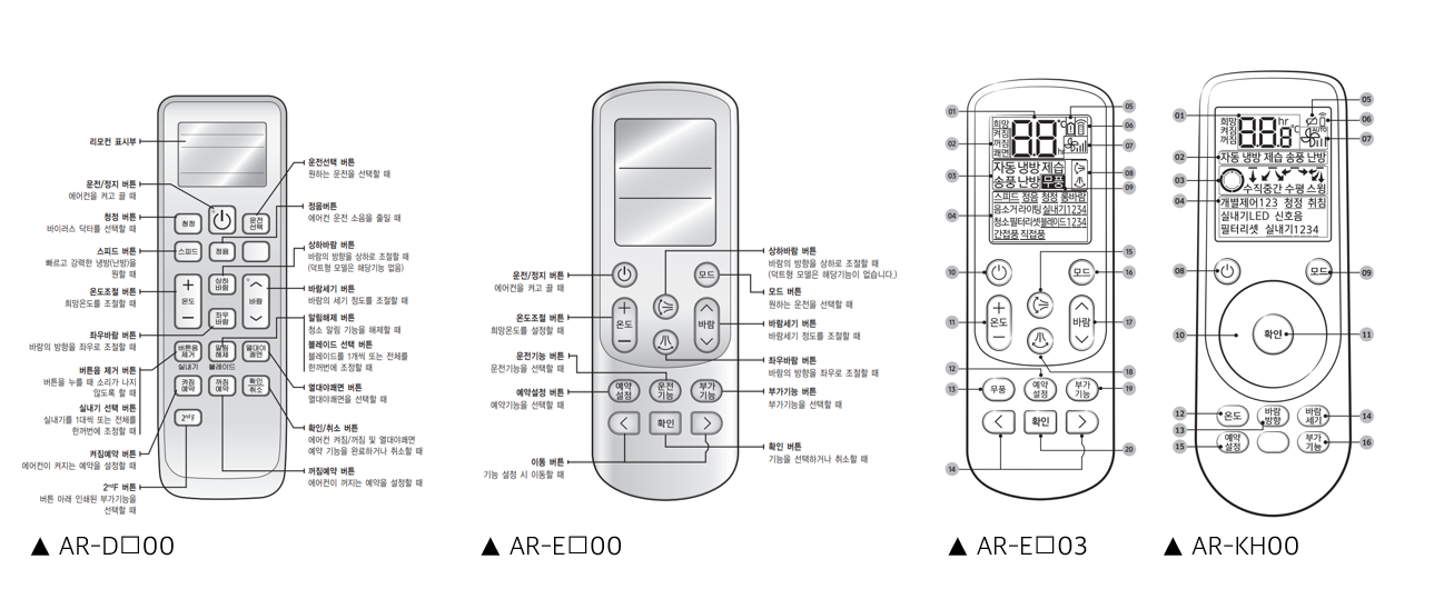 360 카세트 전용 AR-KH0*** 리모컨은 [온도] + [예약설정] 버튼을 동시에, OLED 리모컨 AR-BH00은 [무풍] + [스피드] 버튼을 동시에 눌러주세요.