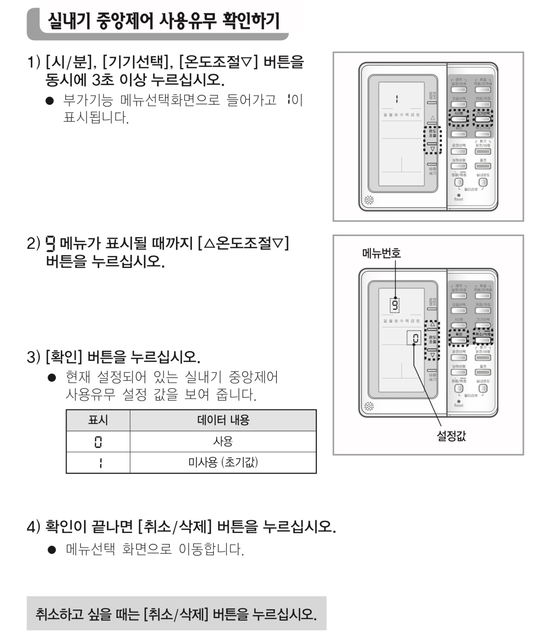9번 메뉴로 진입하면 아래에 0 또는 1이 표시됩니다. 0은 중앙제어 사용, 1은 중앙제어 미사용입니다.