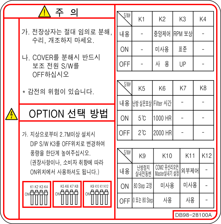 에어컨 그릴을 열었을 때 PCB 커버에 DIP스위치를 통한 OPTION 선택 방법에 대한 안내가 있다면 리모컨 입력을 시도하지 마시고, 차단기를 내리고 커버를 열어 DIP스위치를 조작하십시오.