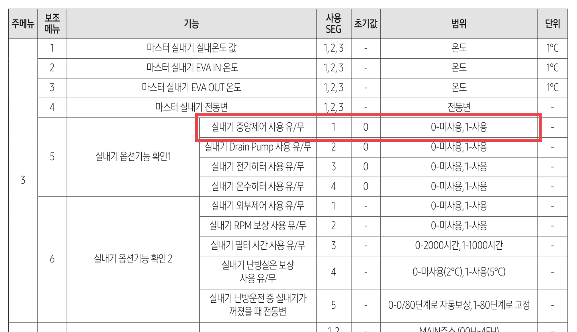 중앙제어 옵션은 SEG5입니다. 위 이미지에서 점멸하는 숫자가 중앙제어 옵션입니다.