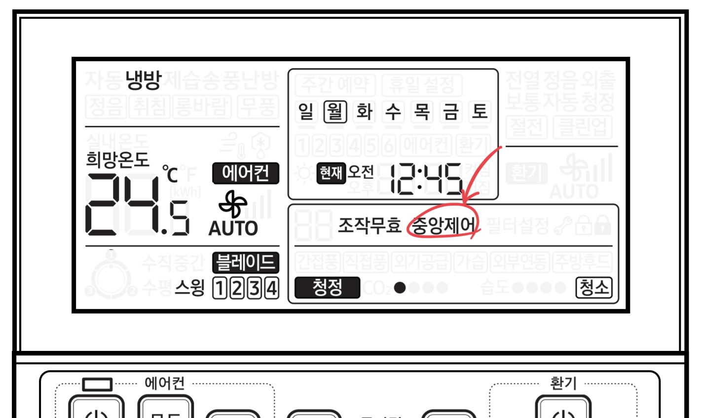 만약 유선리모컨이 안 되는데 무선리모컨으로 작동이 된다면 유선리모컨 잠금 설정을 확인해보세요. 자물쇠 아이콘이 떠있다면 중앙제어가 아니라 사용자가 직접 리모컨을 잠근 것입니다.