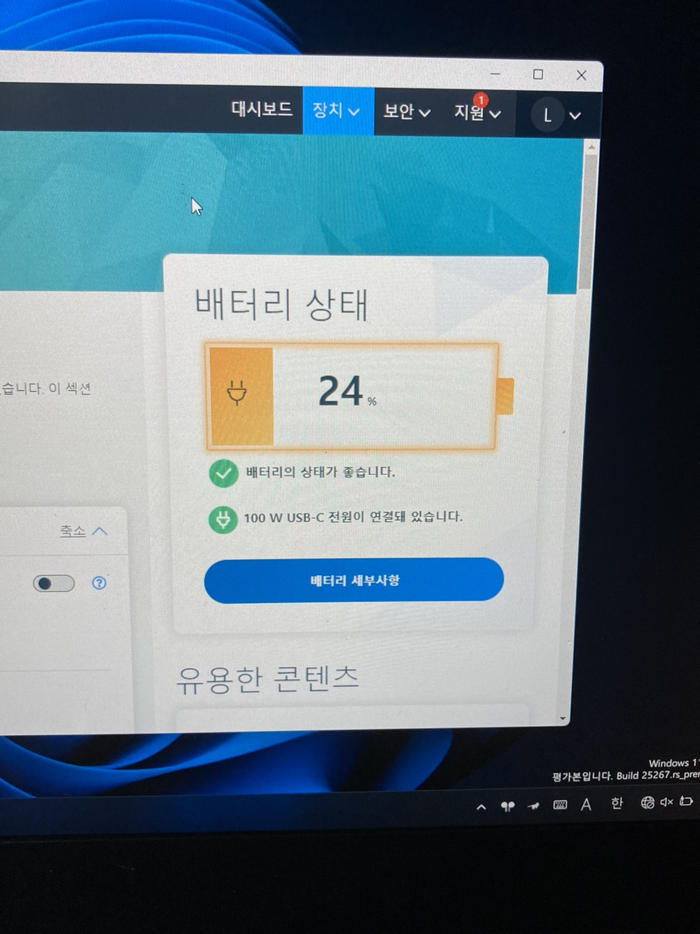 Lenovo Vantage 앱에서 현재 연결된 충전기의 W수를 알 수 있습니다.