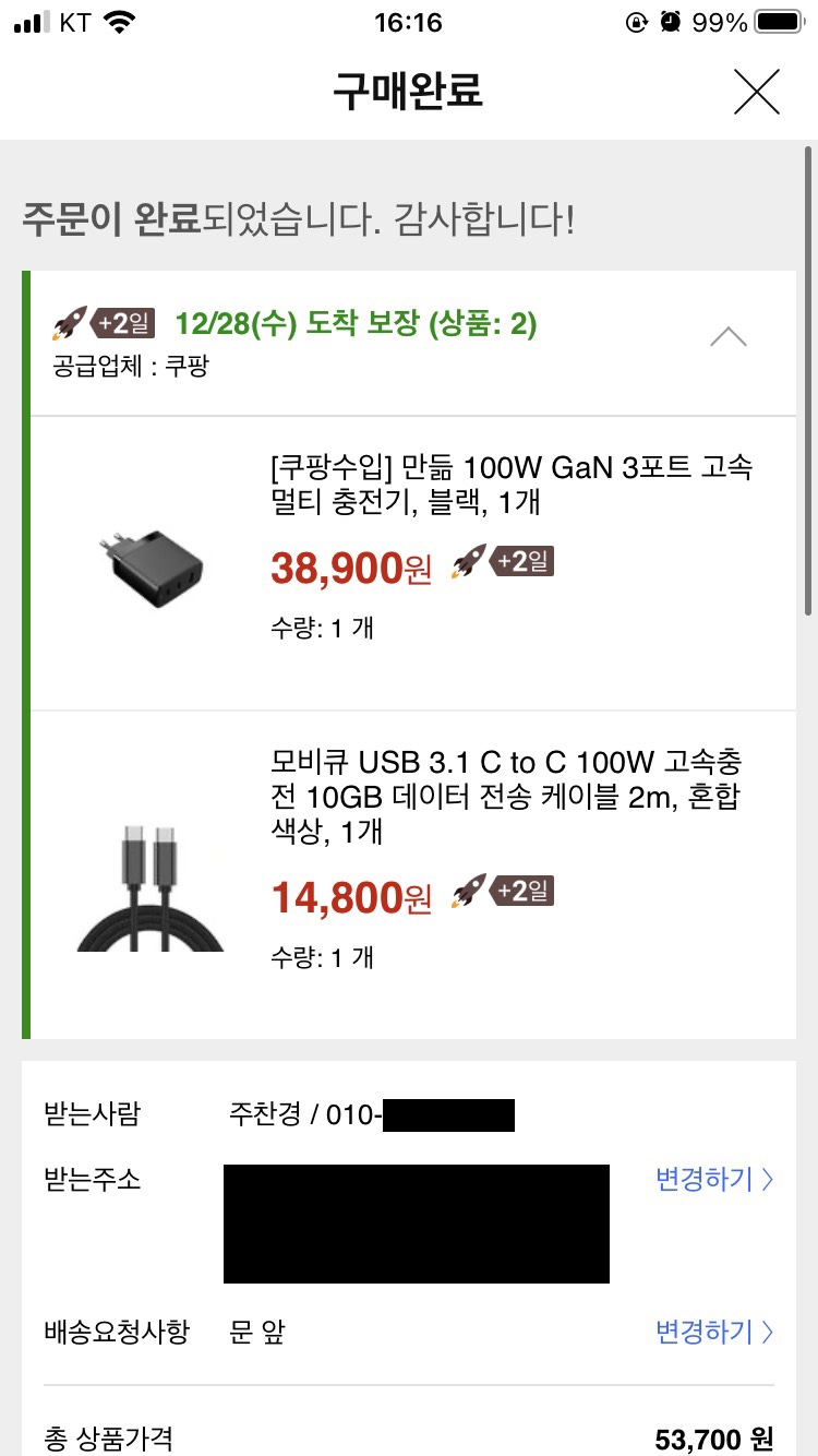 쿠팡에서 수입한다는 만듦 GaN 100W 충전기와 USB-C to C 100W 지원 케이블입니다.